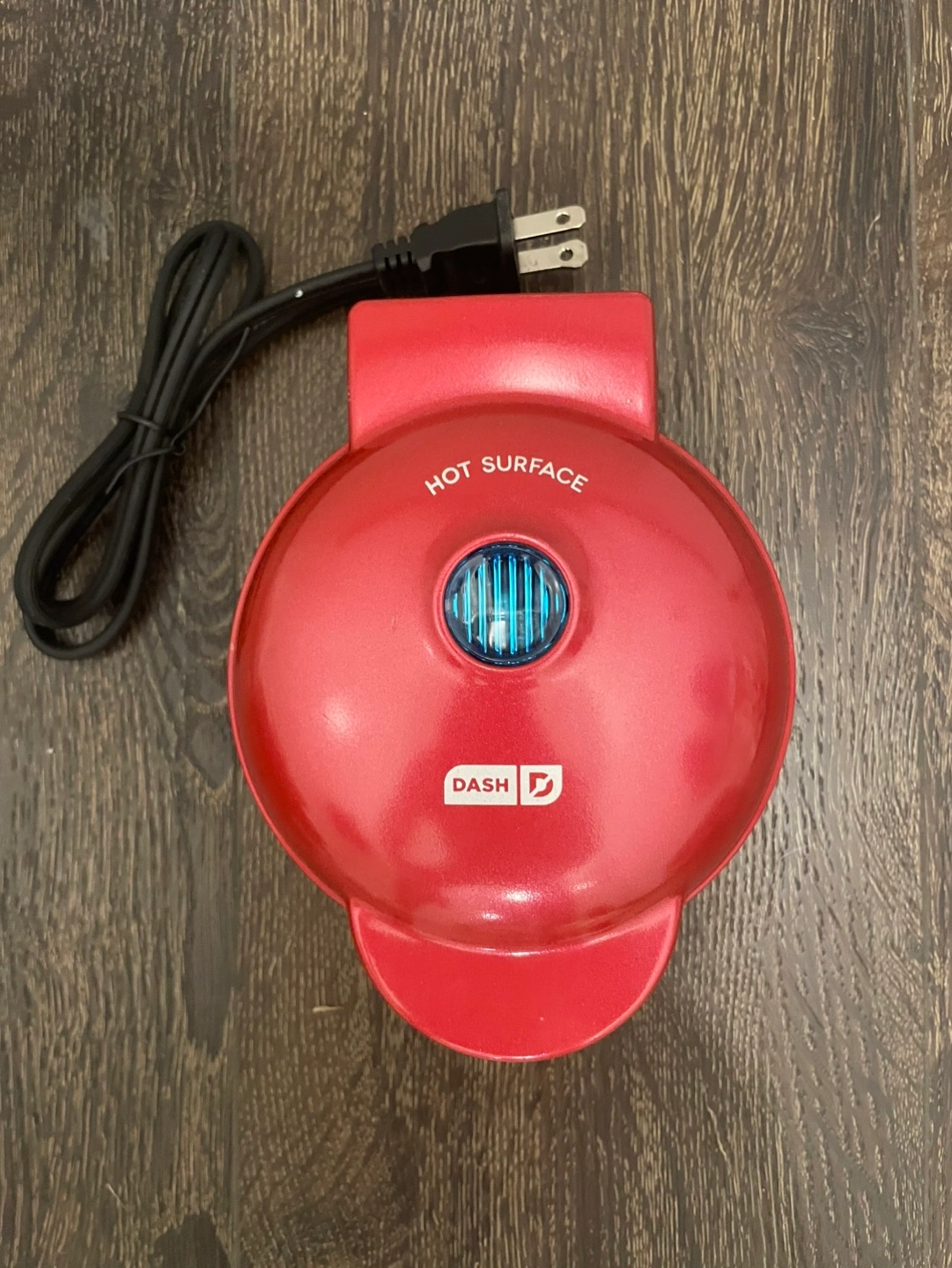 Dash Red mini waffle maker. Makes gingerbread man shaped waffles.