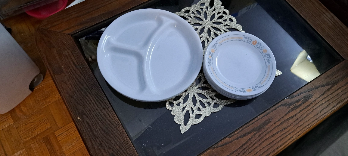 Corelle Divided Plate and Stack of Salad Plates