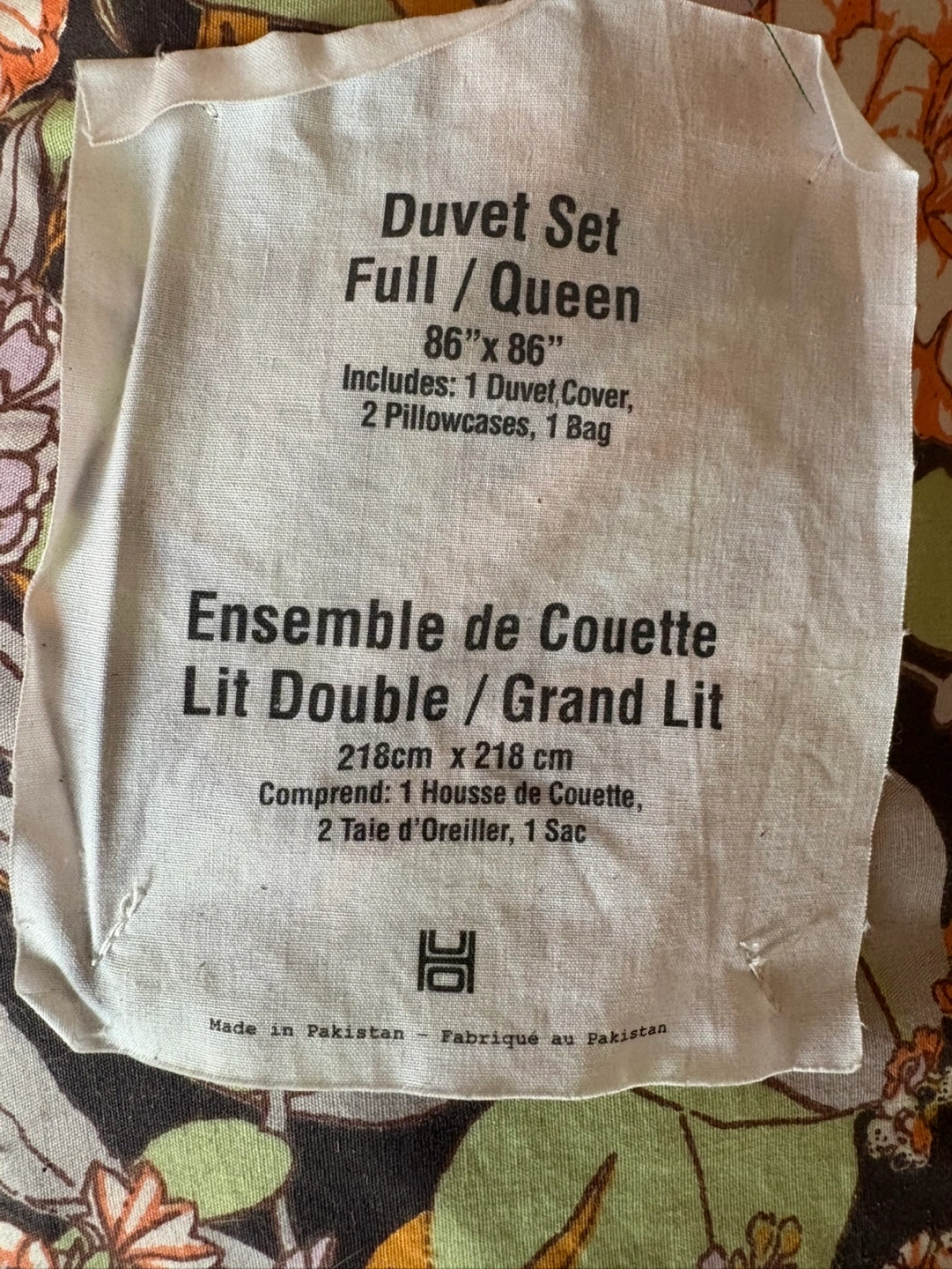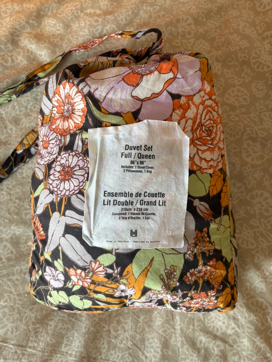 Beautiful floral duvet cover set. Full/Queen size. Includes duvet cover, two pillowcases, and a storage bag. Made in Pakistan. Never opened/used. Originally from urban outfitters for $130+