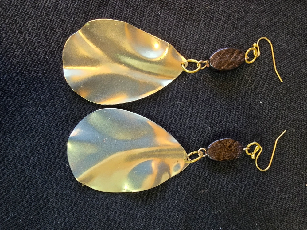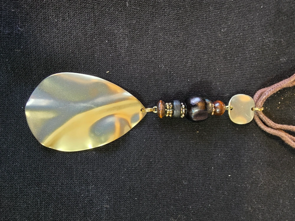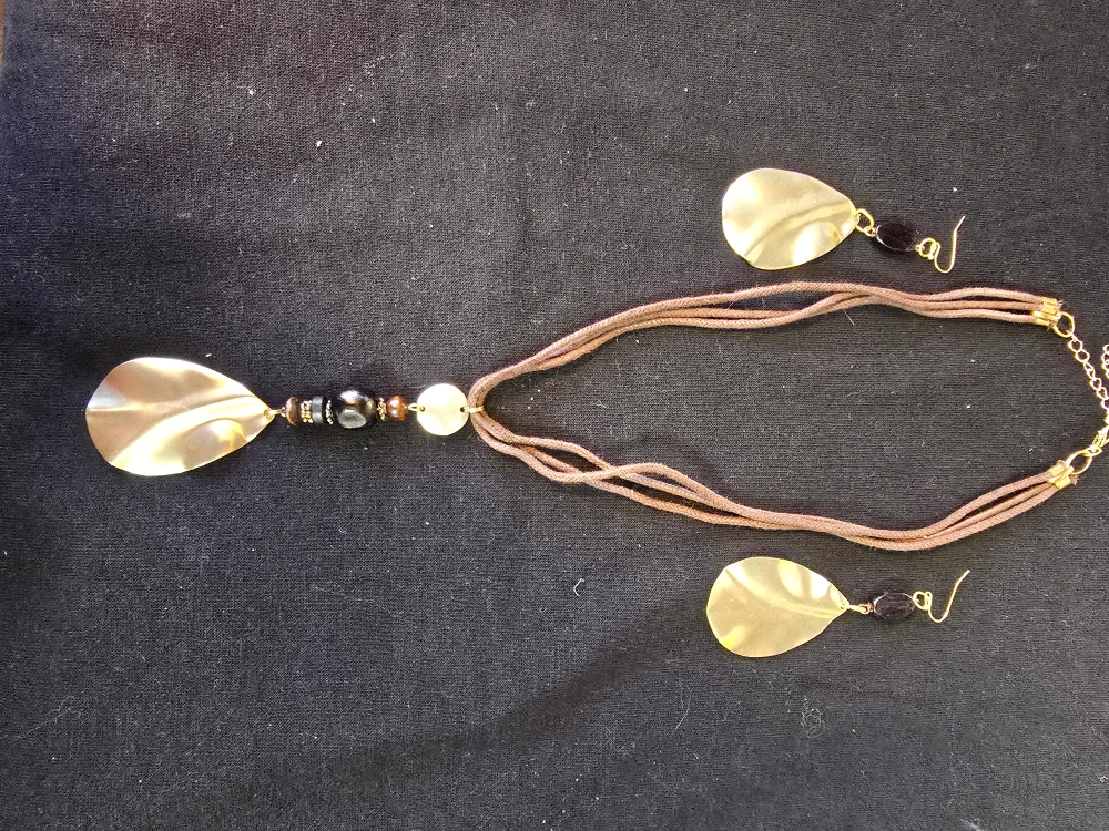 Unique necklace and earring set. Features gold tone leaf-shaped pendants and dark brown wooden beads. Cord necklace. Lightweight and stylish.