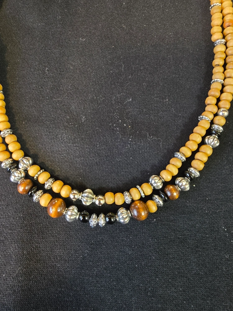 Beautiful handmade jewellery set. Features a double-strand necklace, matching bracelet, and earrings. Wooden beads and metal accents. Unique and stylish.