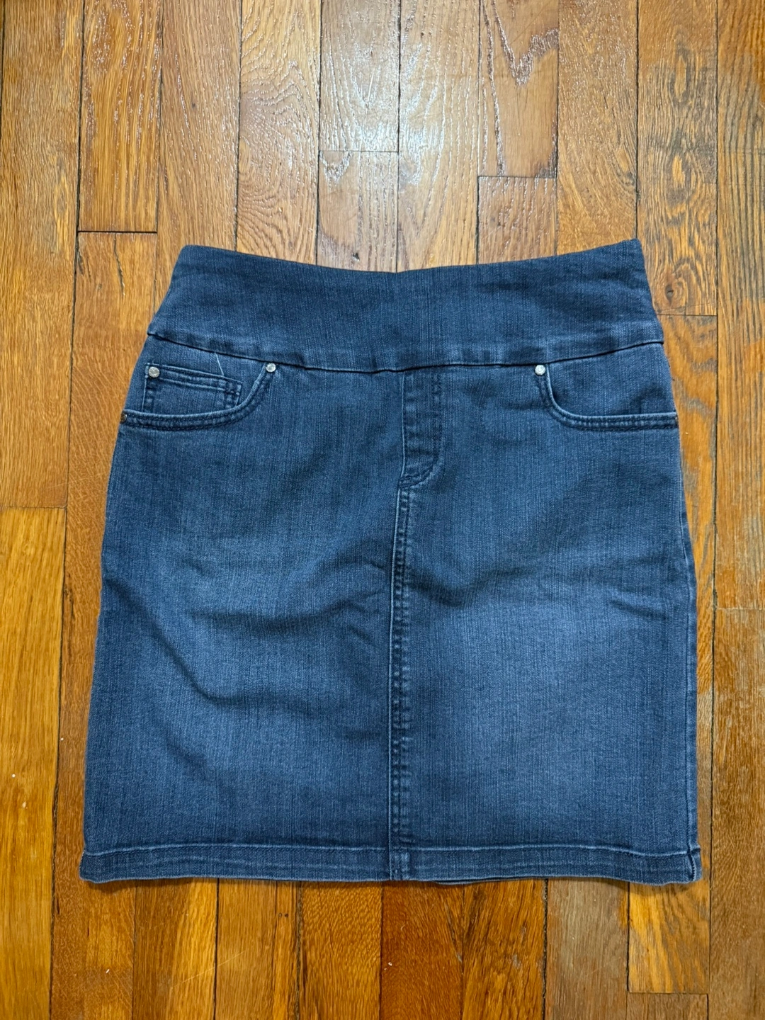 Dark wash denim mini skirt.
