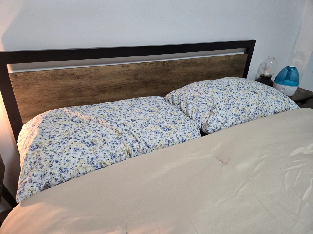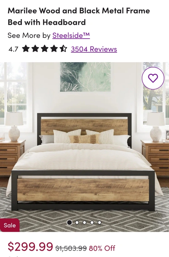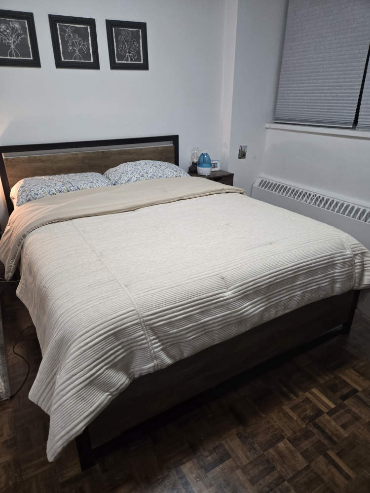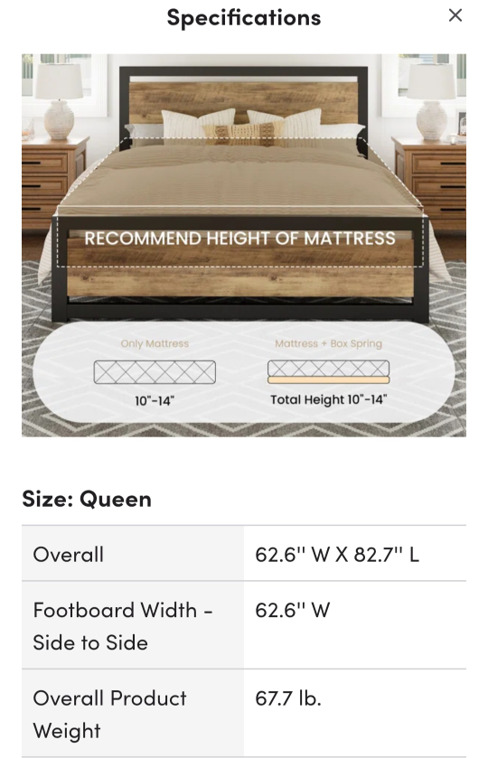 Queen size platform bed frame. Black metal frame and distressed wood headboard and footboard. Sleek, modern design. No box spring needed. Lots of under bed storage space.
