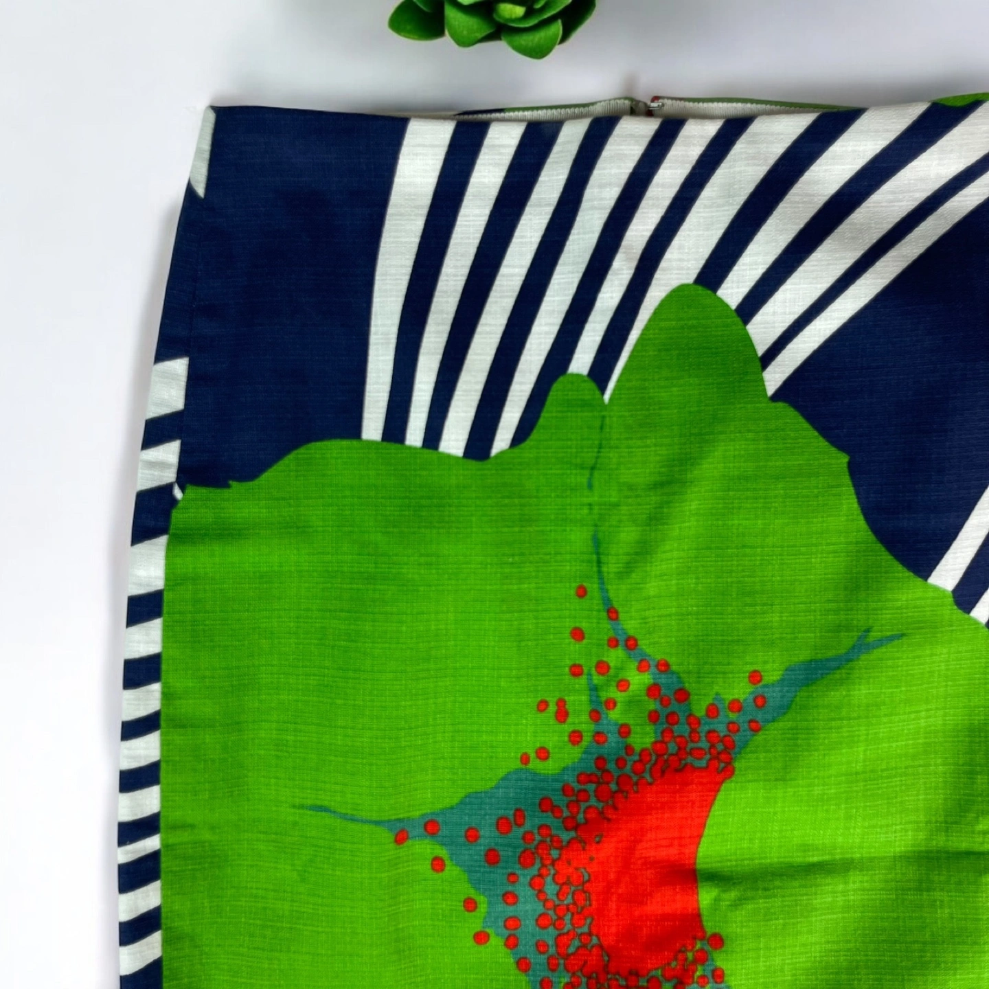 A classic pencil skirt silhouette in textured grass cloth fabric with a vibrant and retro inspired striped floral motif from Italy's Ratti print house (home to some of the world's most amazing prints since 1945). A gorgeous statement piece ideal for career, resortwear or brunch with friends!