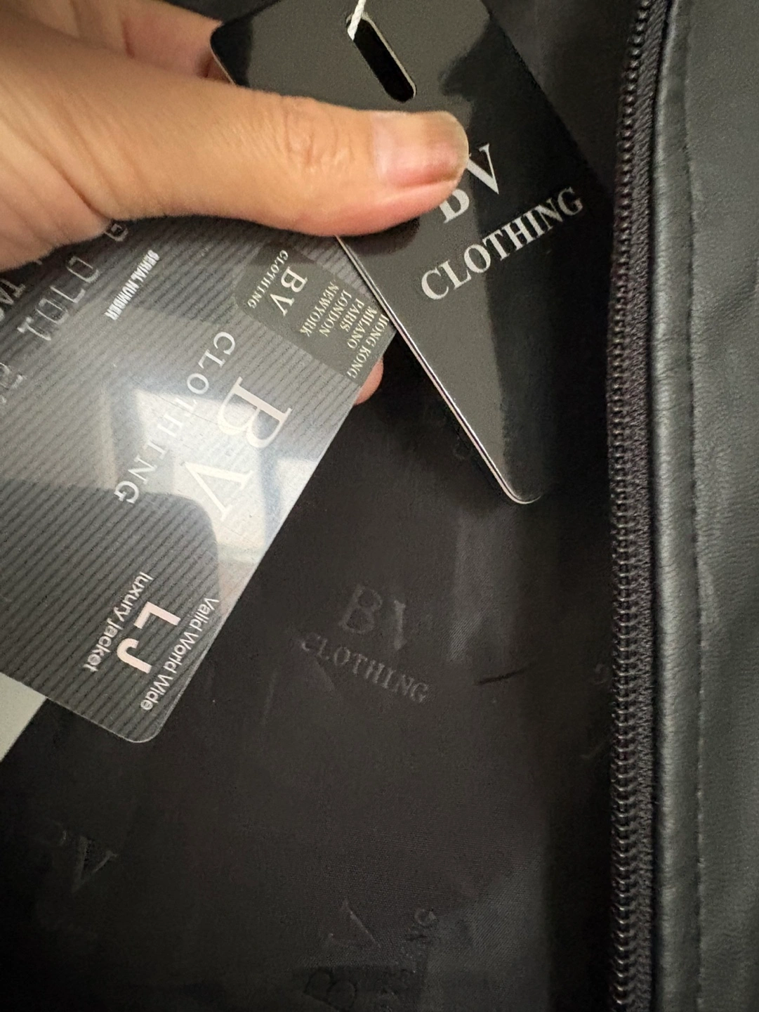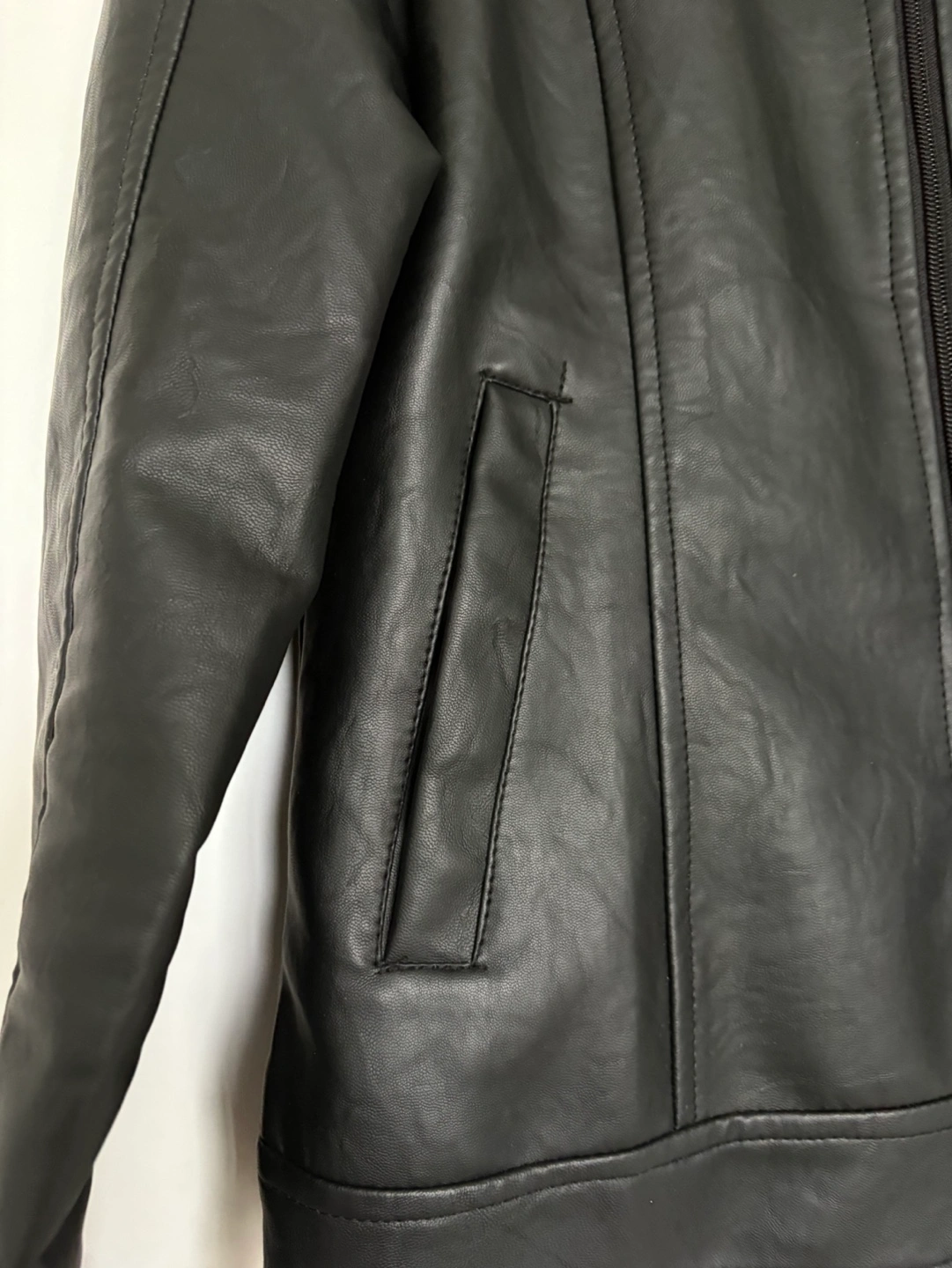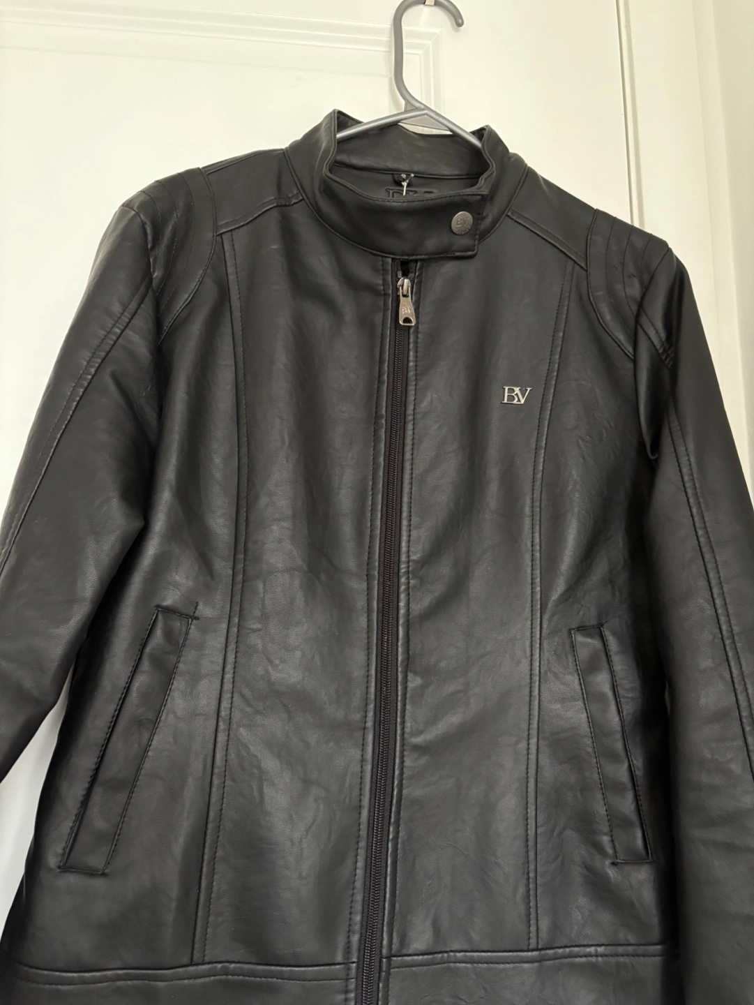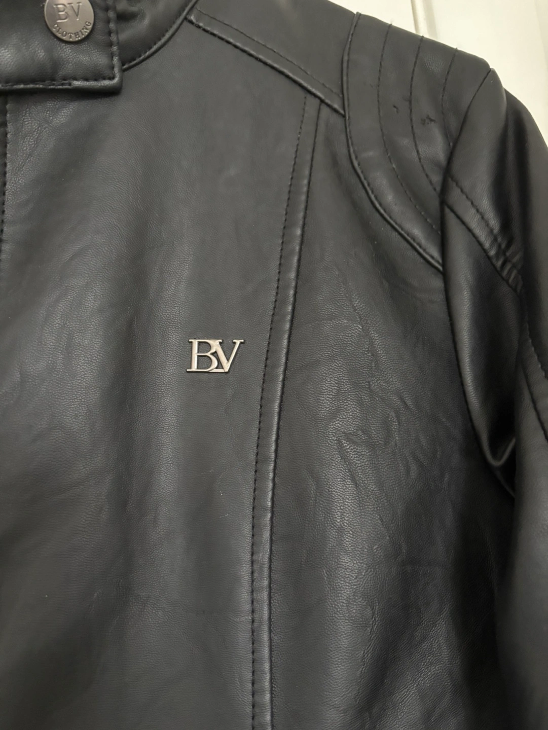 Men black faux leather jacket. Zipper closure. Two front pockets. Small BV Gioielli logo on sleeve and collar. Long sleeves. Good condition.