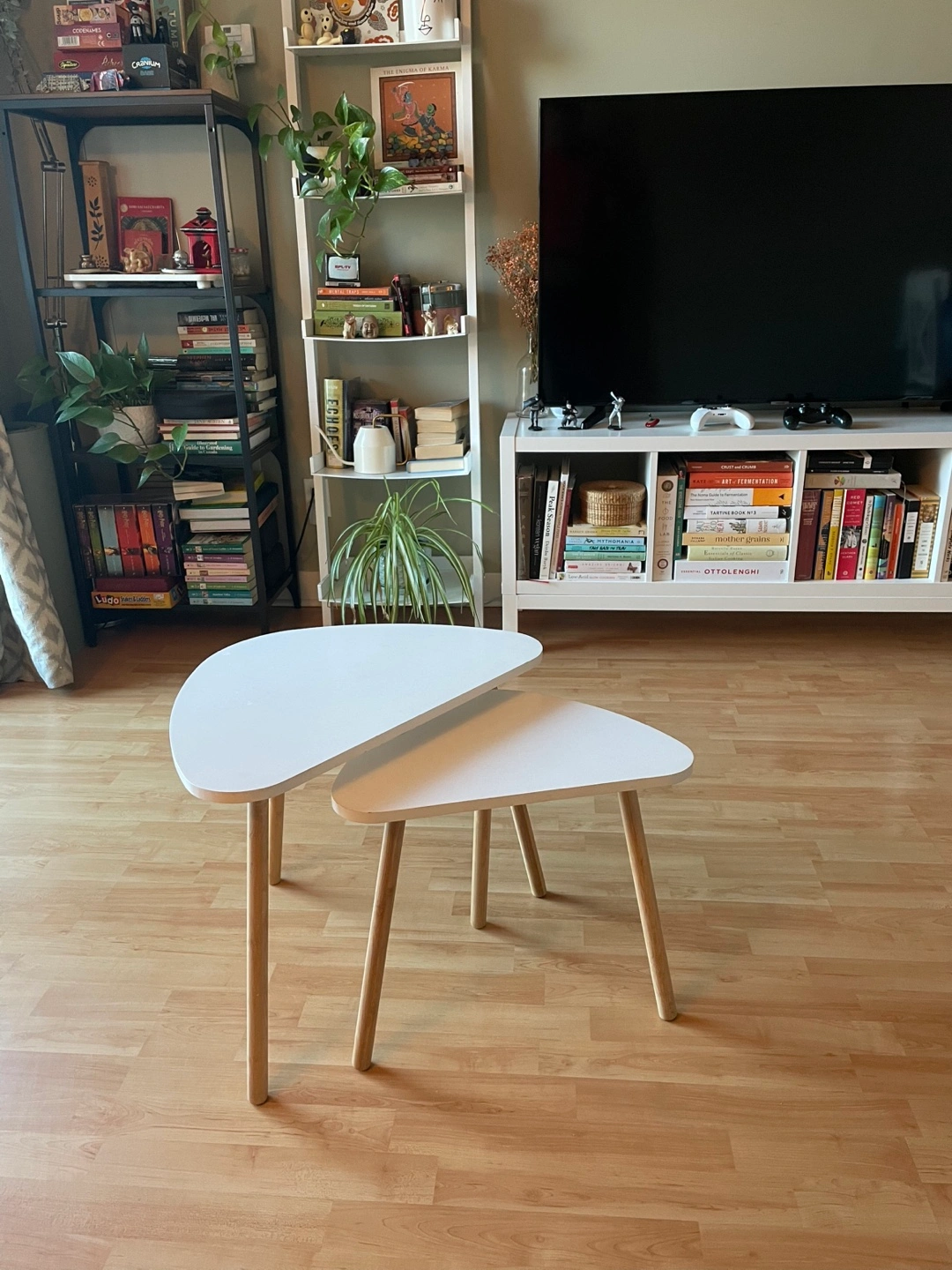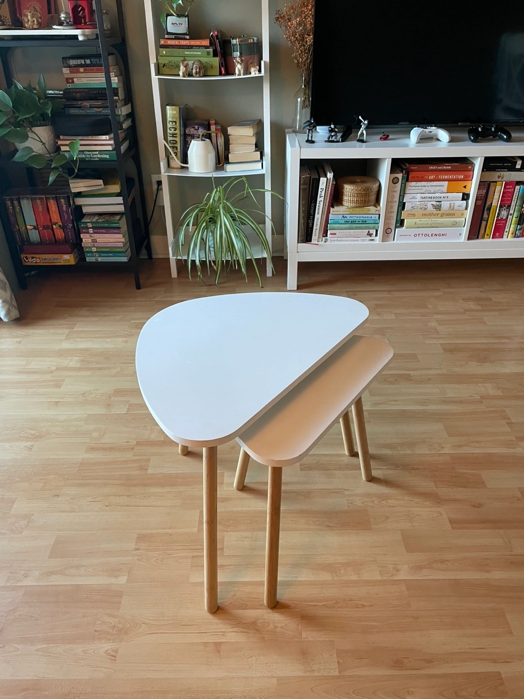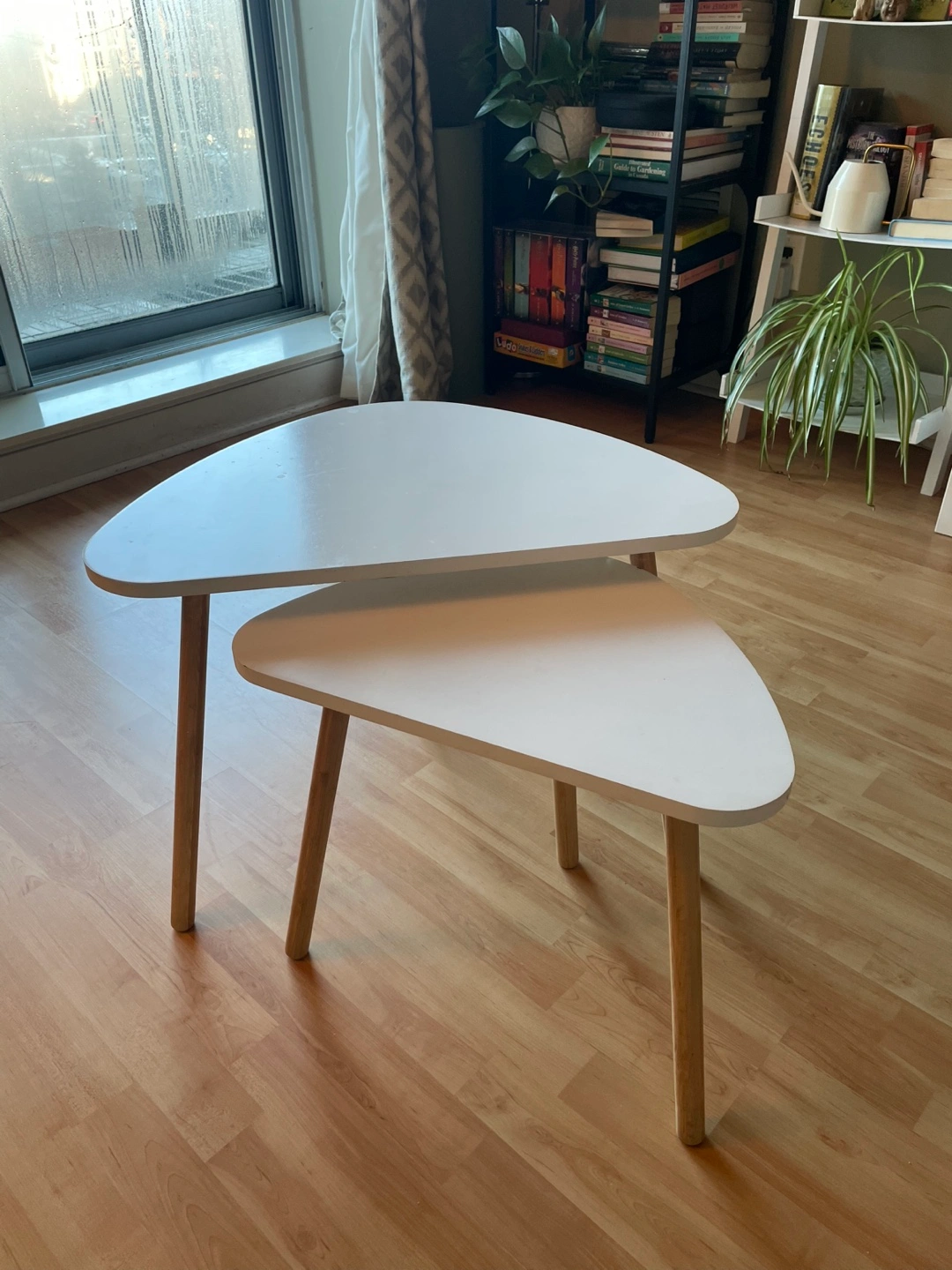 Set of two nesting tables. Unique freeform shape. White top and light wood legs. Perfect for a living room or small space.