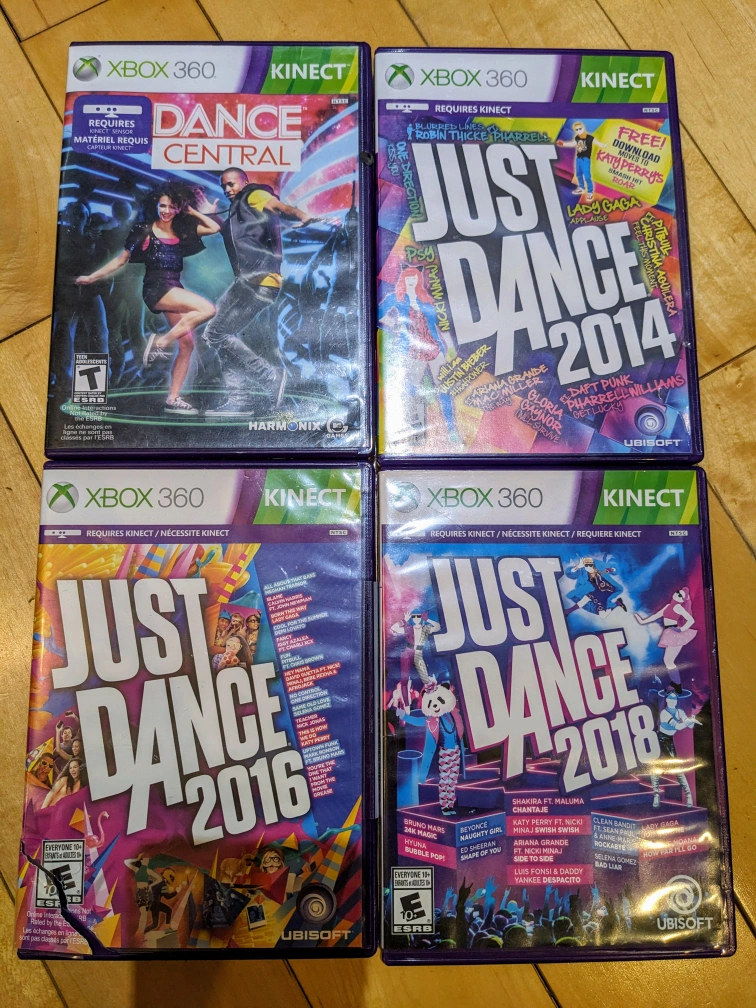 Each $20, Bundle of five Xbox 360 Kinect games. Includes Just Dance 2014, Just Dance 2016, Just Dance 2018, Dance Central, and The Biggest Loser Ultimate Workout. Requires Kinect sensor. Pre-owned.