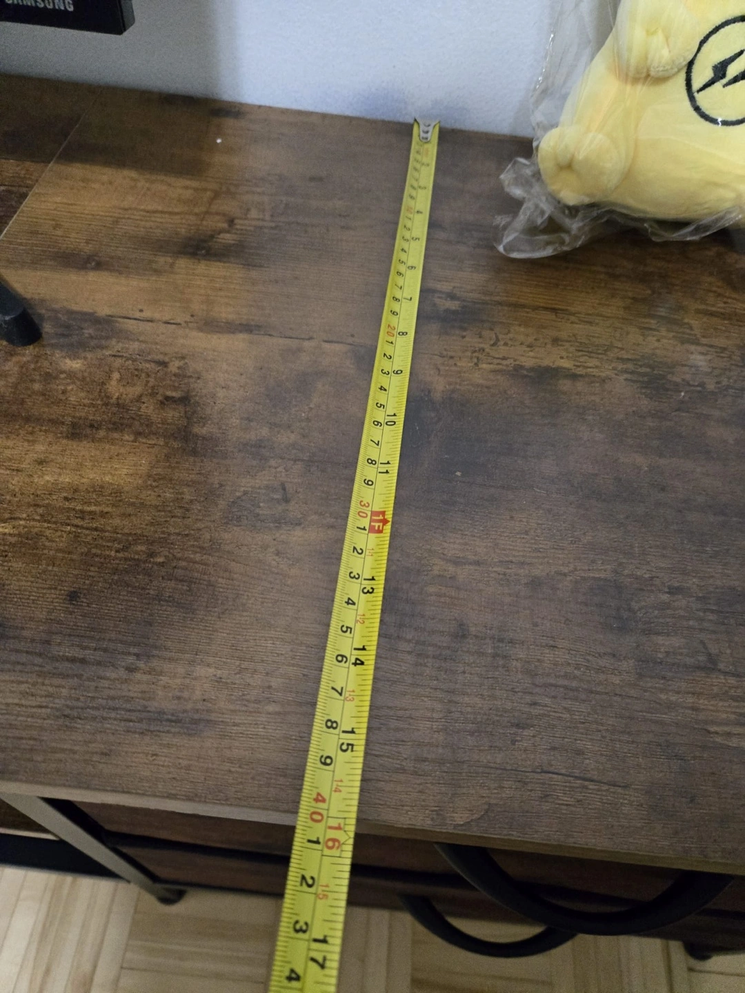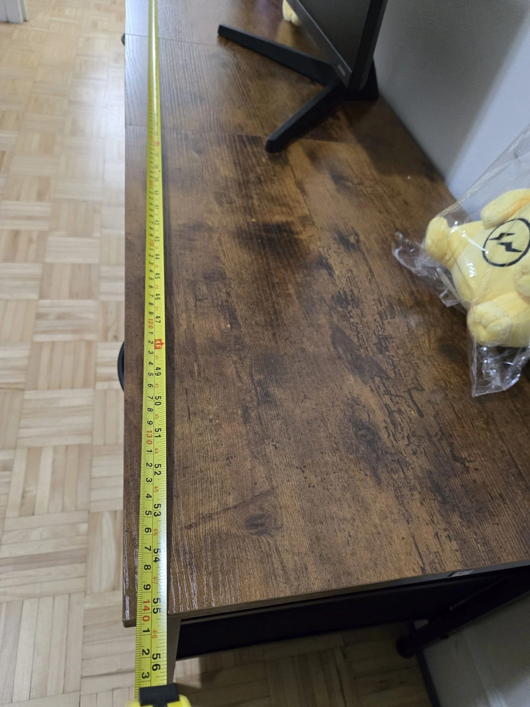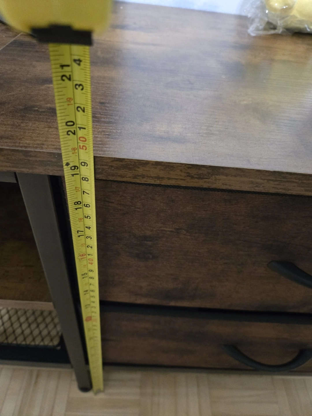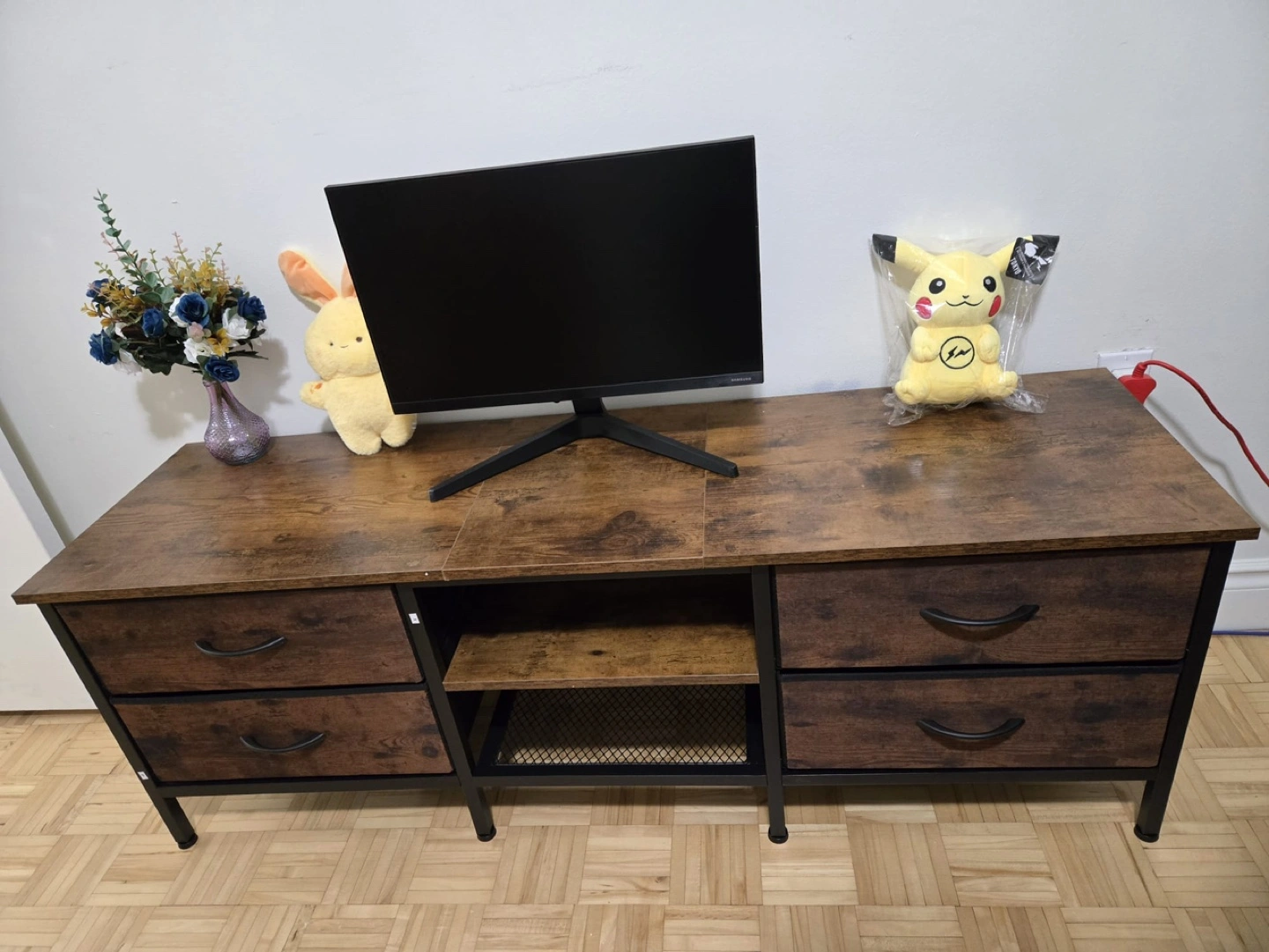 Large TV stand, dark brown wood finish. Four drawers, open shelving. Metal legs and accents. Measures approximately 56 inches wide.