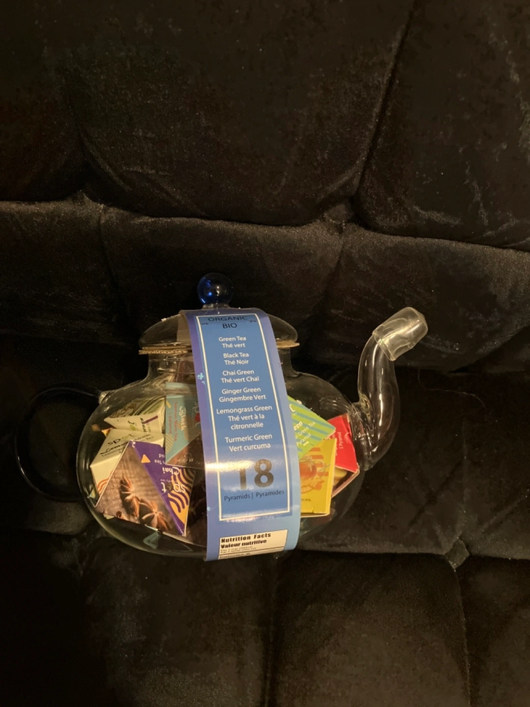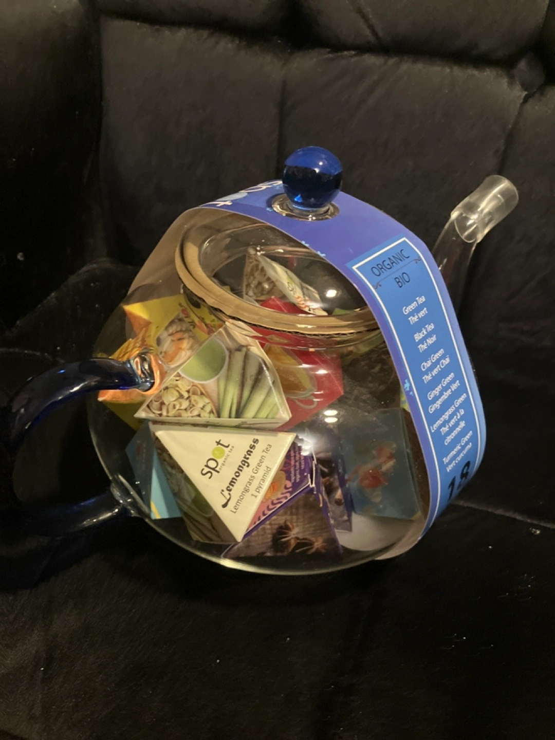 Clear glass teapot with blue handle and lid. Contains 18 individually wrapped tea pyramids. Variety of organic teas included. Perfect gift or for personal use.
