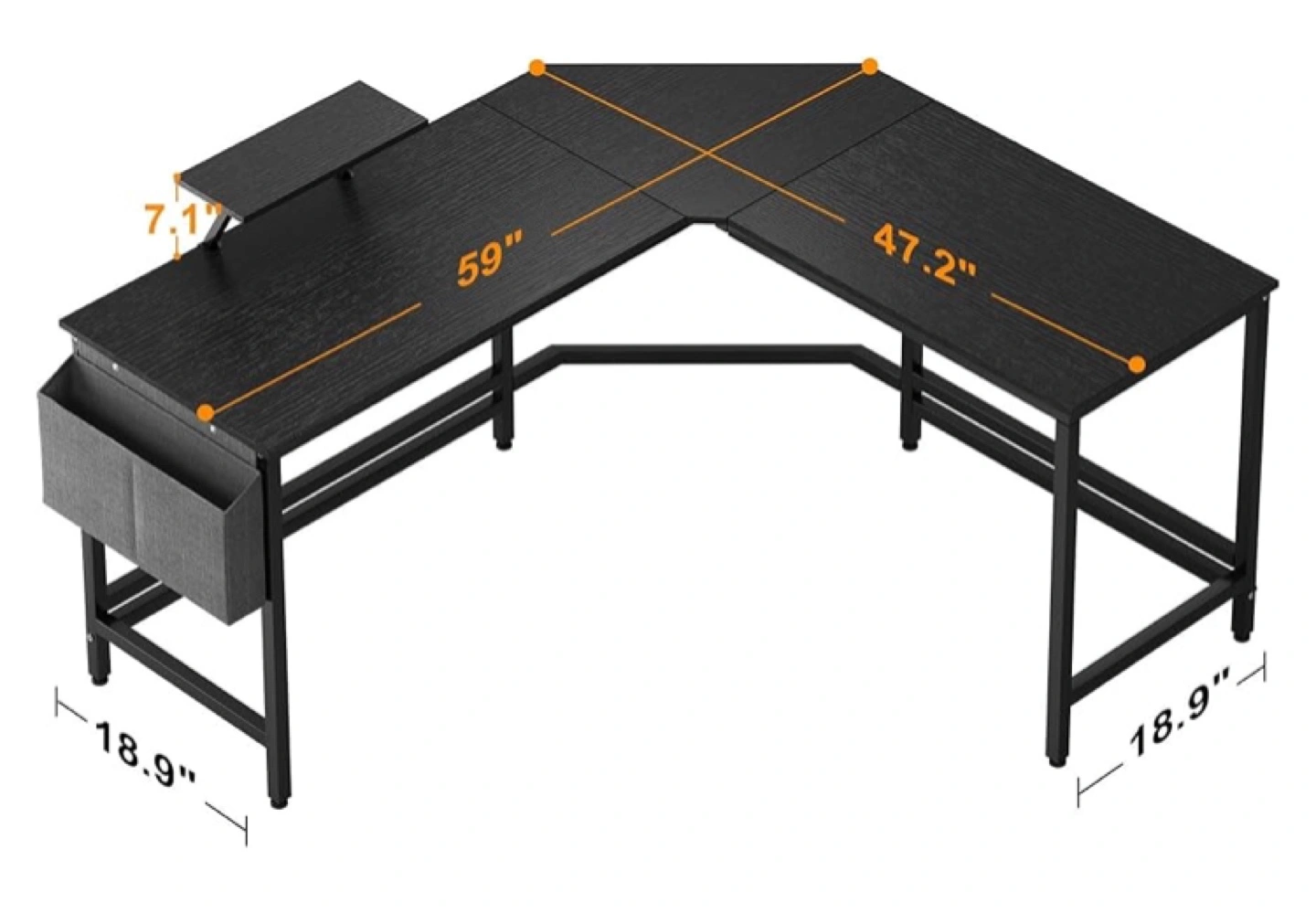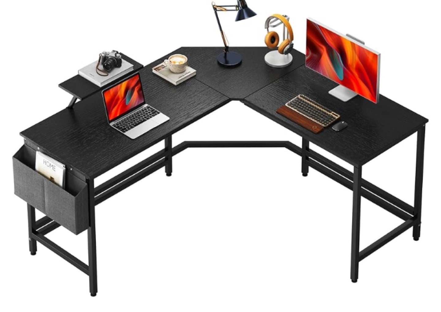 Large L-shaped desk, black wood grain top, metal frame. Features a side storage pouch and small shelf. Perfect for home office or gaming setup. Dimensions shown in image.
