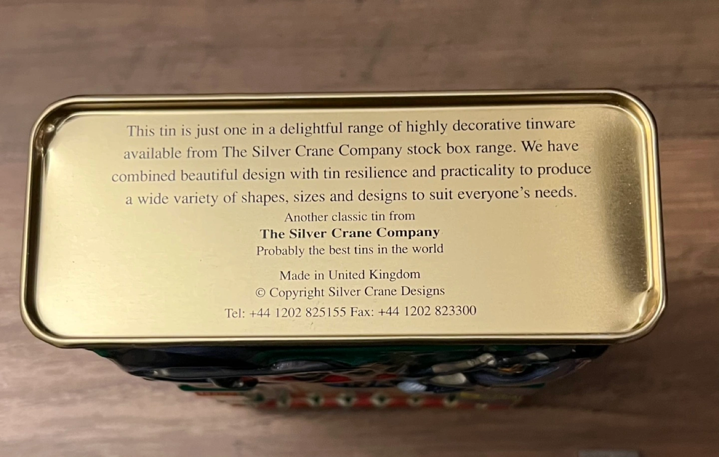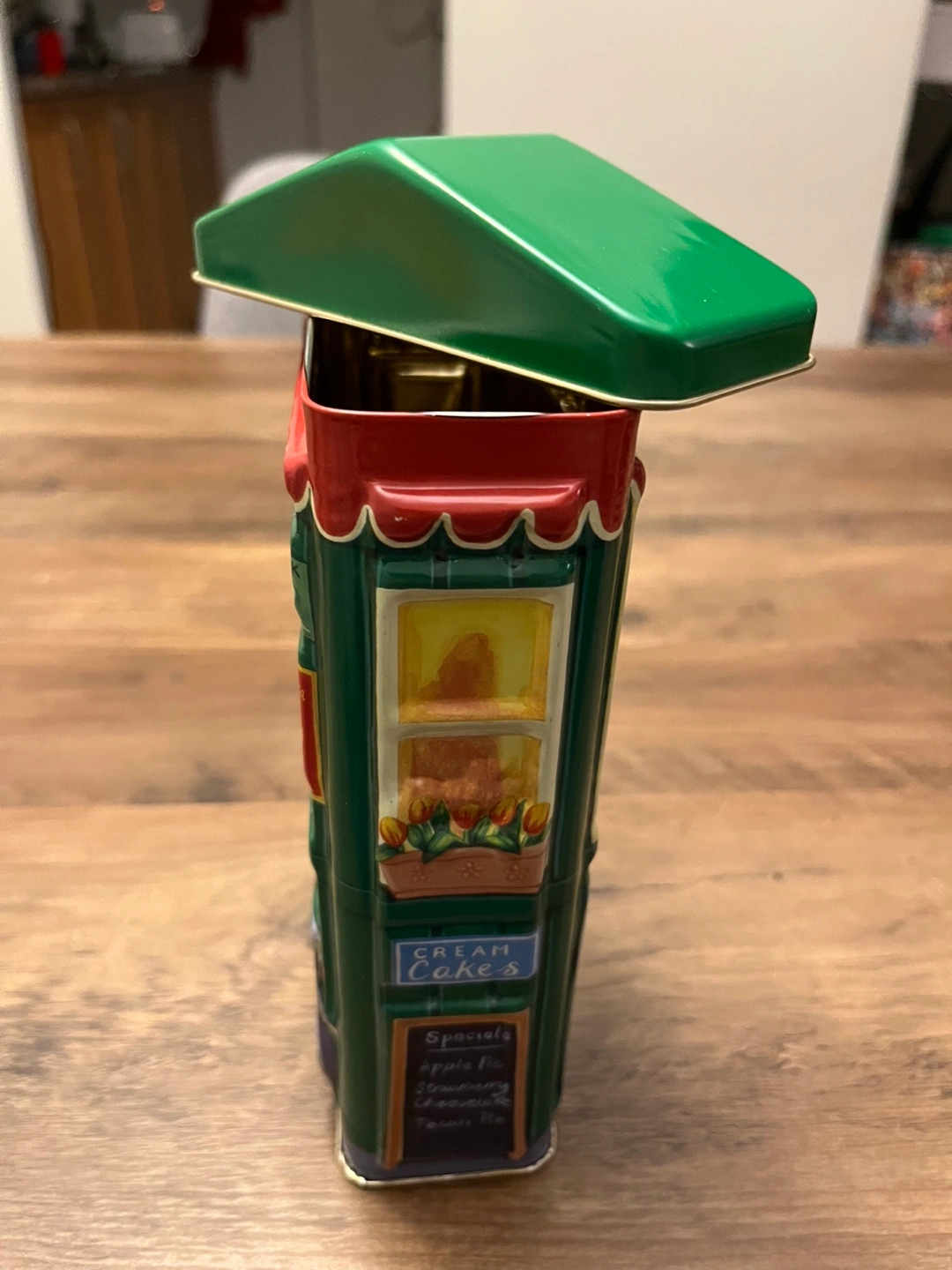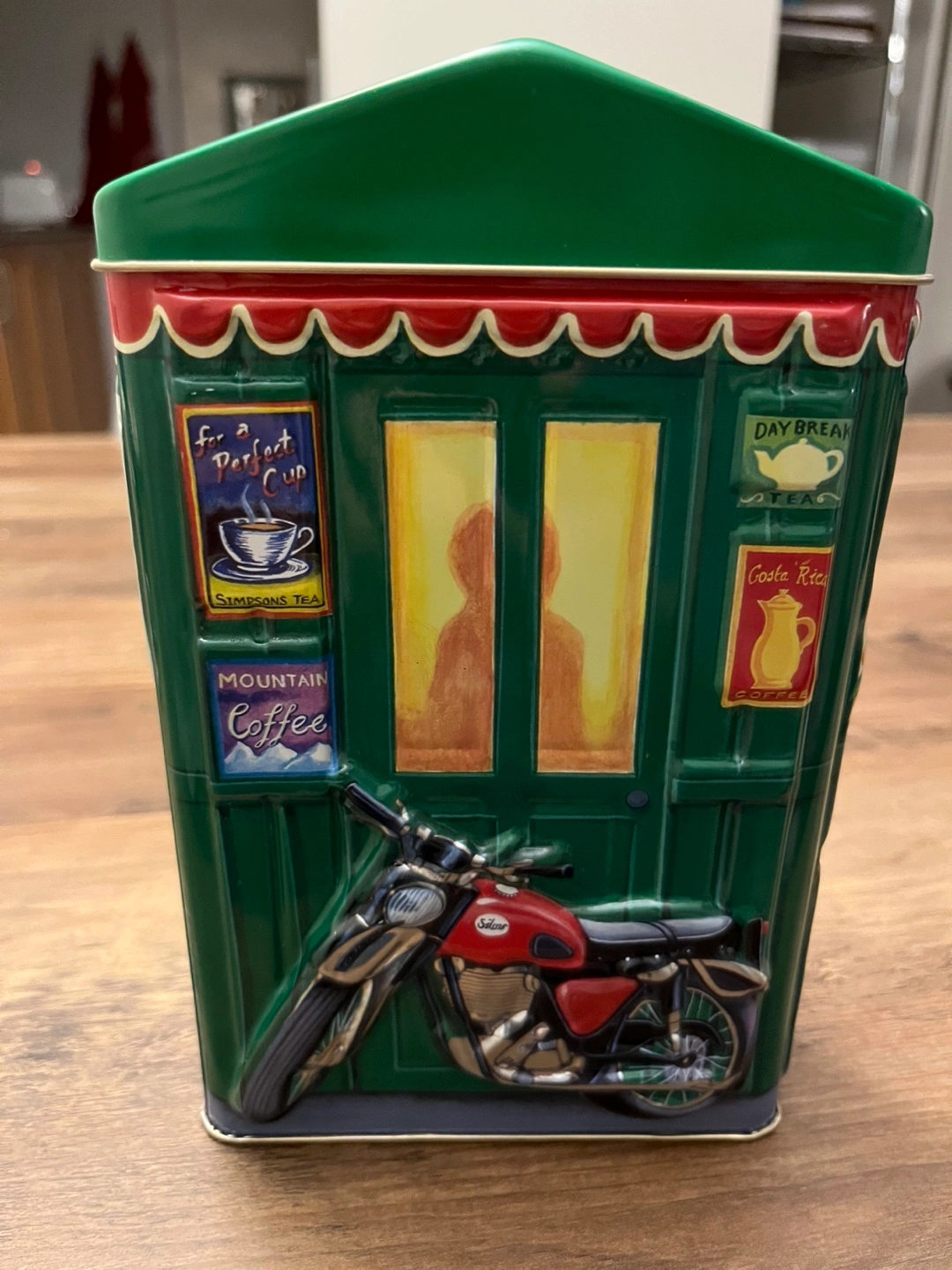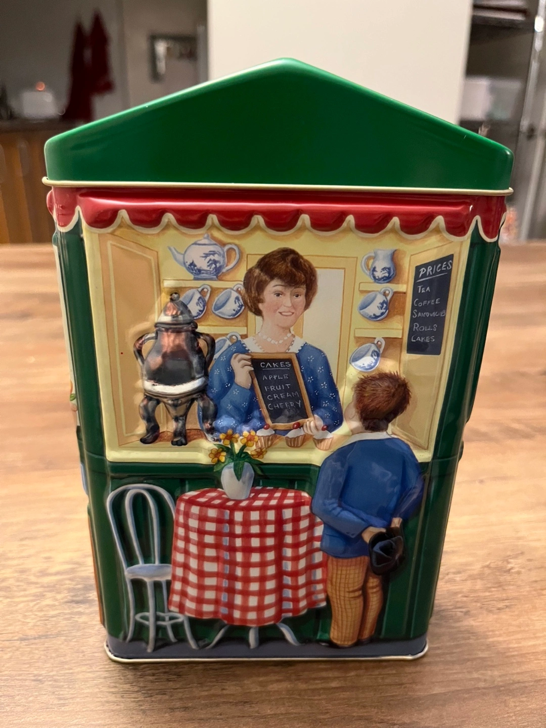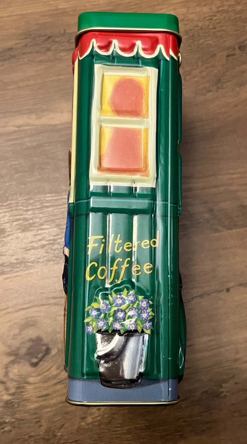 Collectible tin container. Features various images of tea, coffee, and baked goods. Made in the United Kingdom.