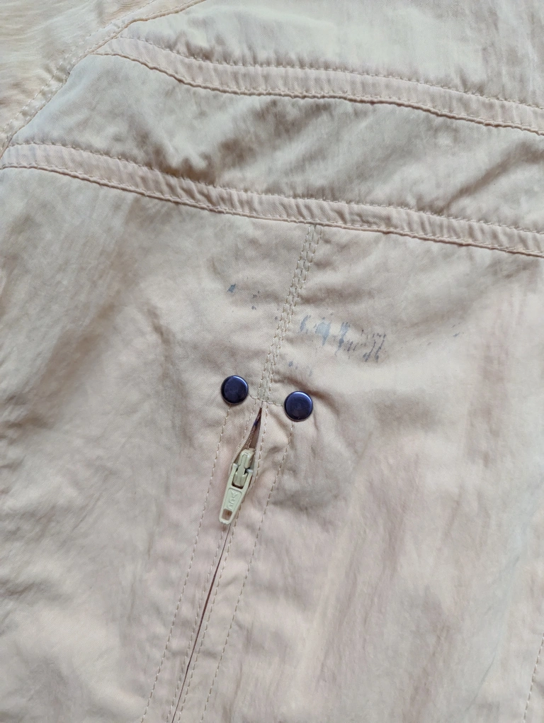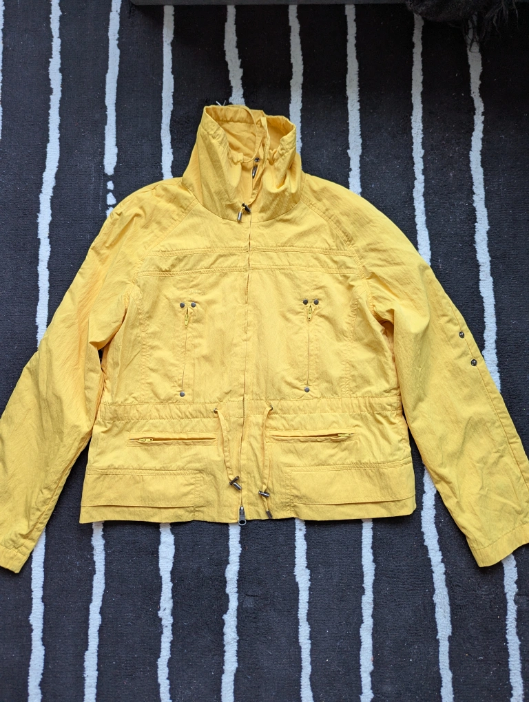 Bright yellow cropped jacket. Size small. Features a high collar, zipper closure, and multiple pockets. Very small stain above right front pocket (pictured). It's been washed but a stain stick should remove it :)
