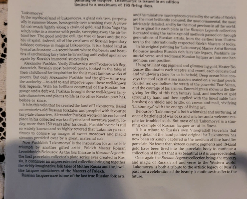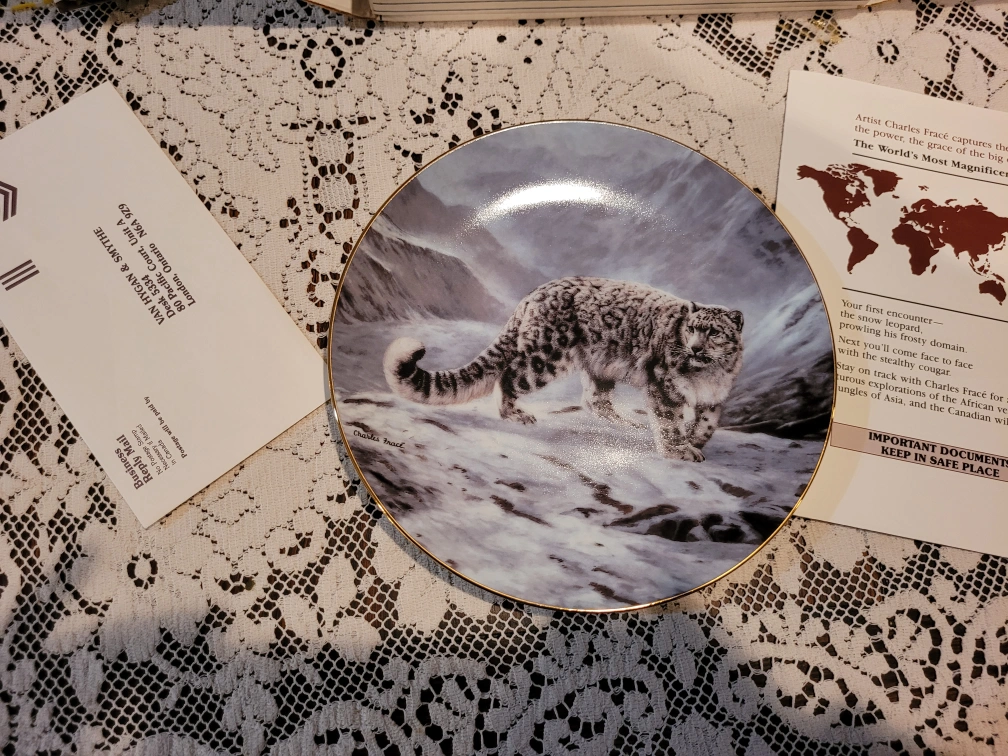 Collectible porcelain plate. Features a snow leopard. Part of the Lukoomorya collection. Artist Charles Fracé. Gold-trimmed edge. Fine detail and vibrant colours.
