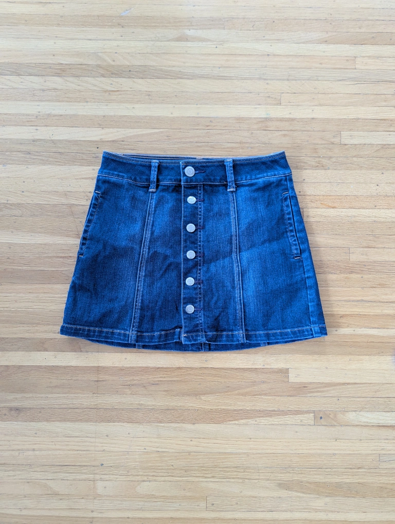 Dark wash denim mini skirt. Button closure. Size 0. Stretch material. Excellent condition.