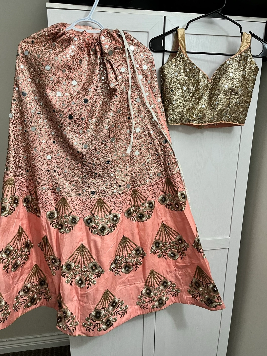 Beautiful peach lehenga choli. Features embroidered floral details and mirror work. Includes matching dupatta. Gorgeous for special occasions.