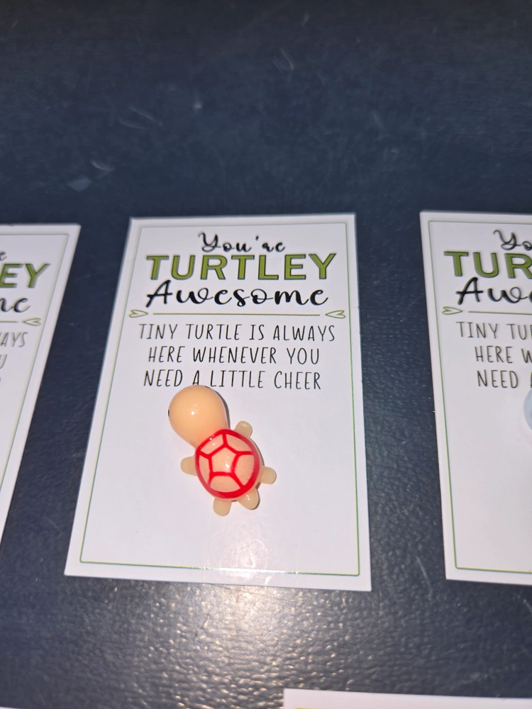 Miniature turtle charms cards. Each turtle features a different colour and comes attached to a card. Perfect for gifts or a sweet pick me up!