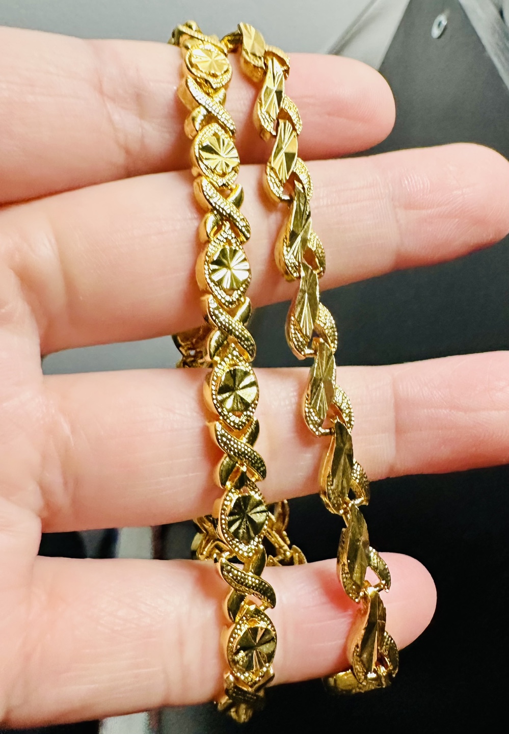 Pair of gold tone bracelets. Intricate designs. One features a criss-cross pattern, the other has leaf-like links. Both are chunky and eye-catching.