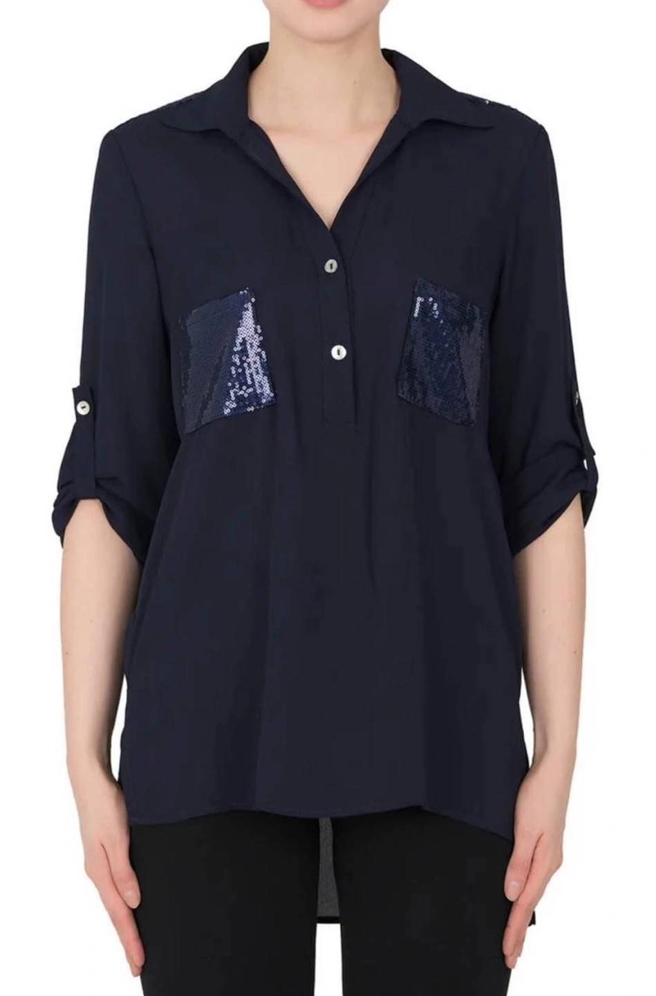 Midnight blue blouse. Sequin detail on pockets. Three-quarter sleeves. 100% polyester. Approximate length (size 12): 33" - 84 cm.