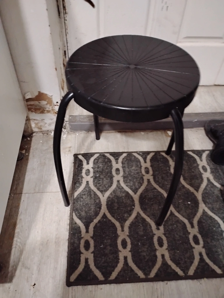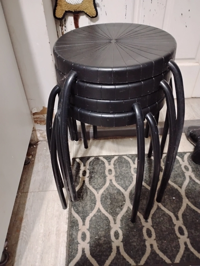 Four stackable stools. Black plastic seat and metal legs. Simple design. Lightweight and easy to move. Most likely ideal for older kids, but has held the weight of a midsized adult. **Must be able to come to location to pick up**