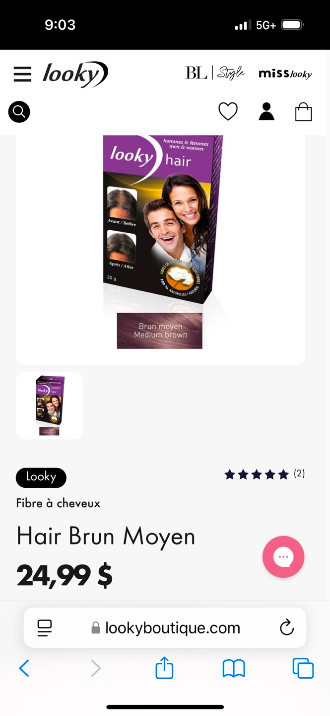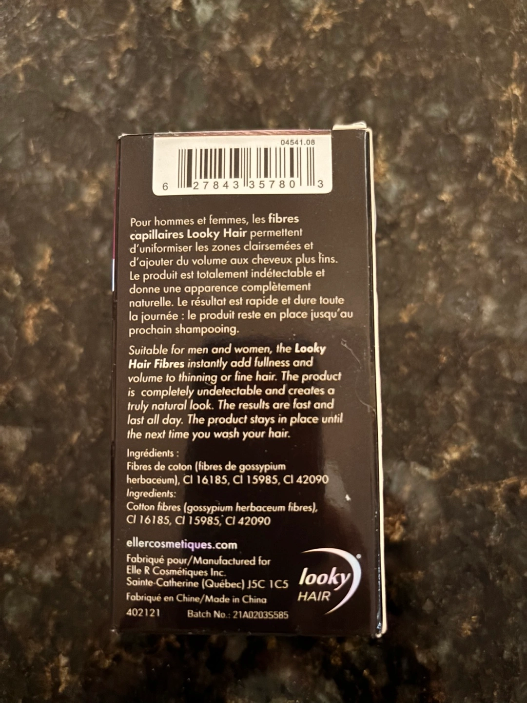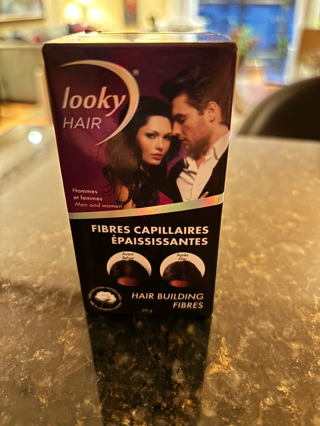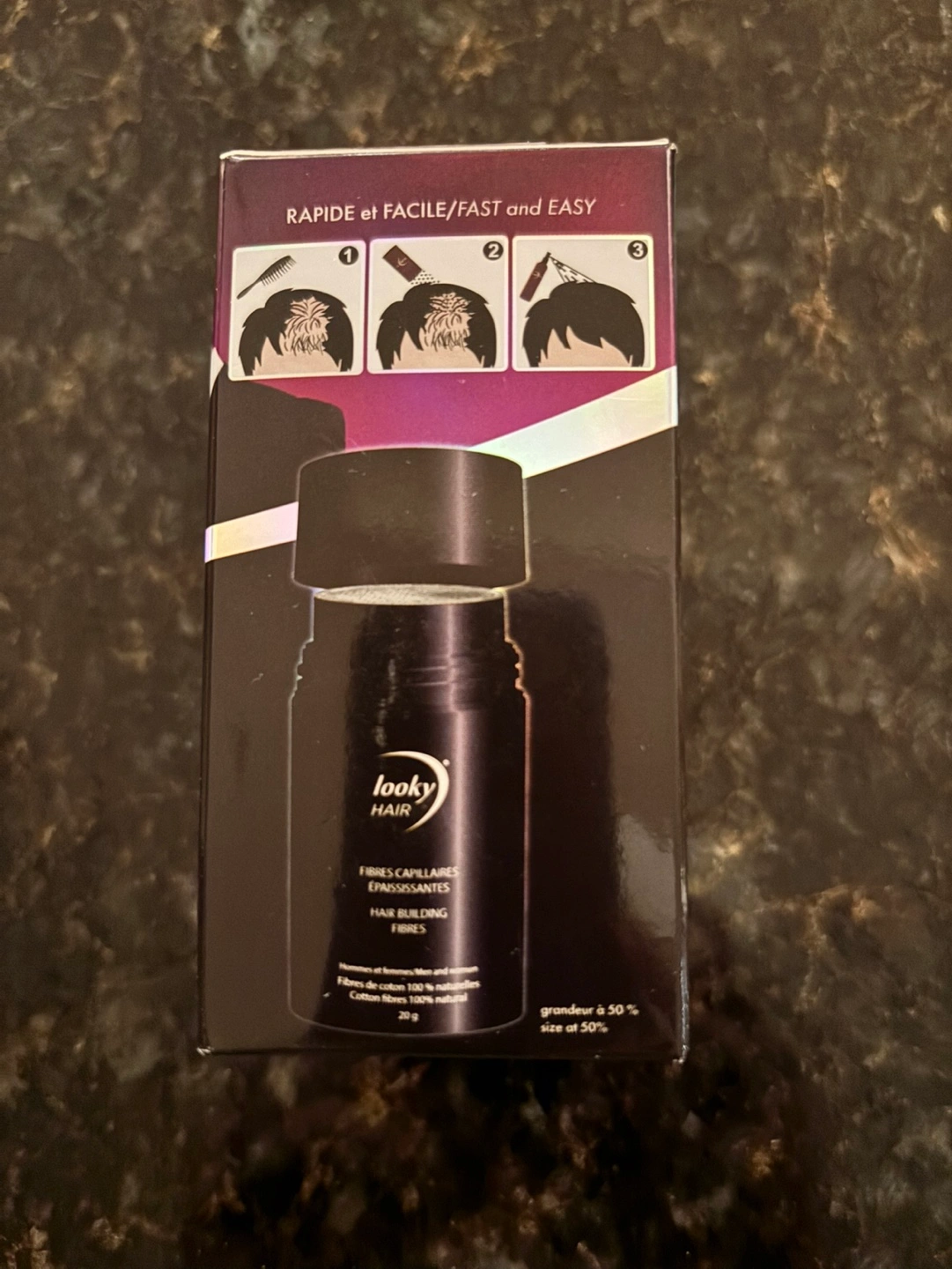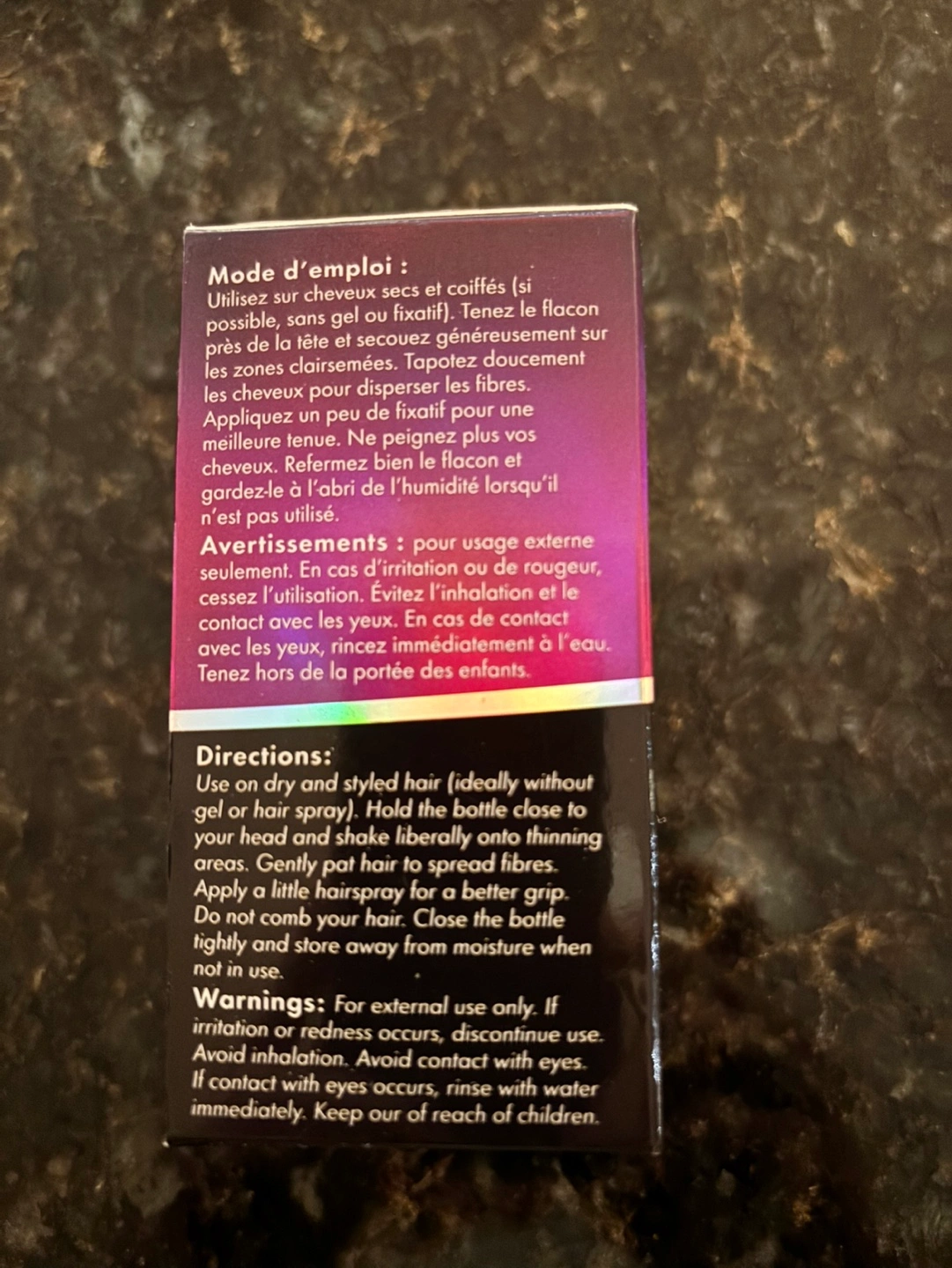 Hair building fibres. Adds volume and fullness. Easy to use. Lasts all day. For men and women. 20g. Listed price is $25.