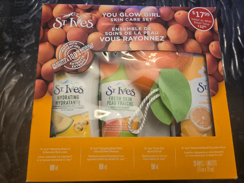 New St. Ives skin care gift set. Includes hydrating body lotion, energizing body wash, fresh skin apricot scrub, and cleanser refresh wipes. Huge set. $33 value. Great value! open to trades- gift cards, household items, pantry items.
