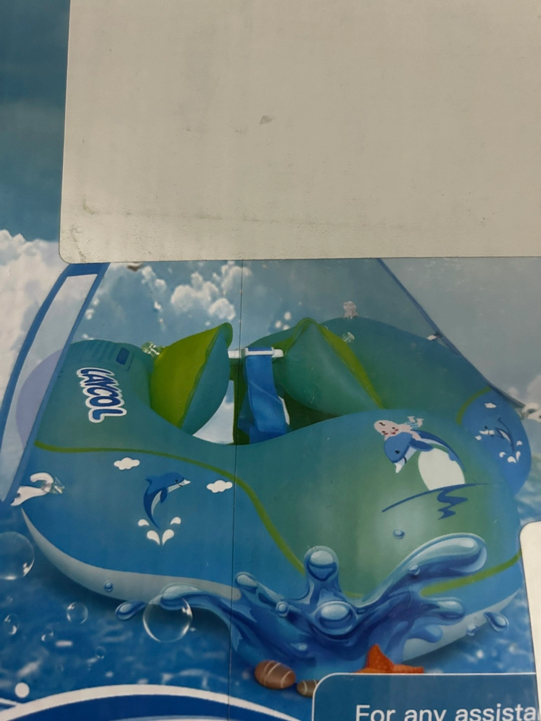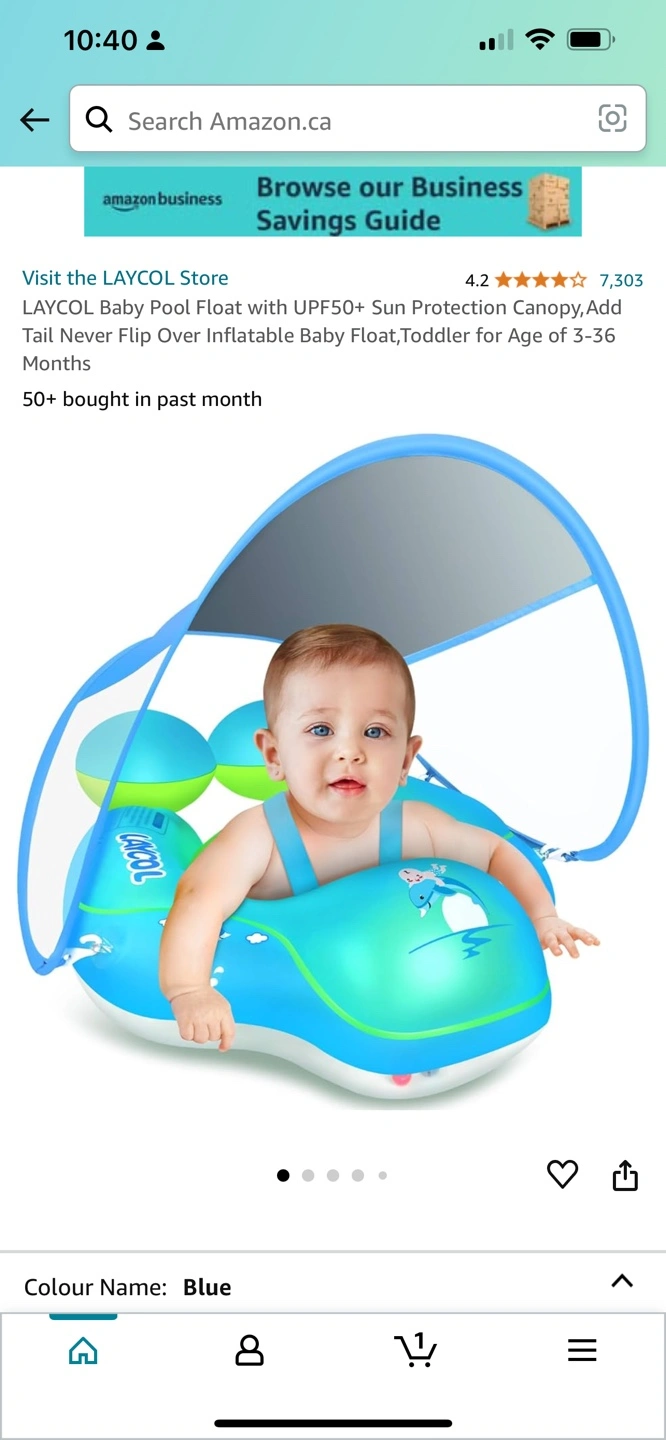 76Inflatable baby float with sun protection. Suitable for toddlers aged 3-36 months. Features a canopy for shade. Blue colour. Yonge and Steeles area