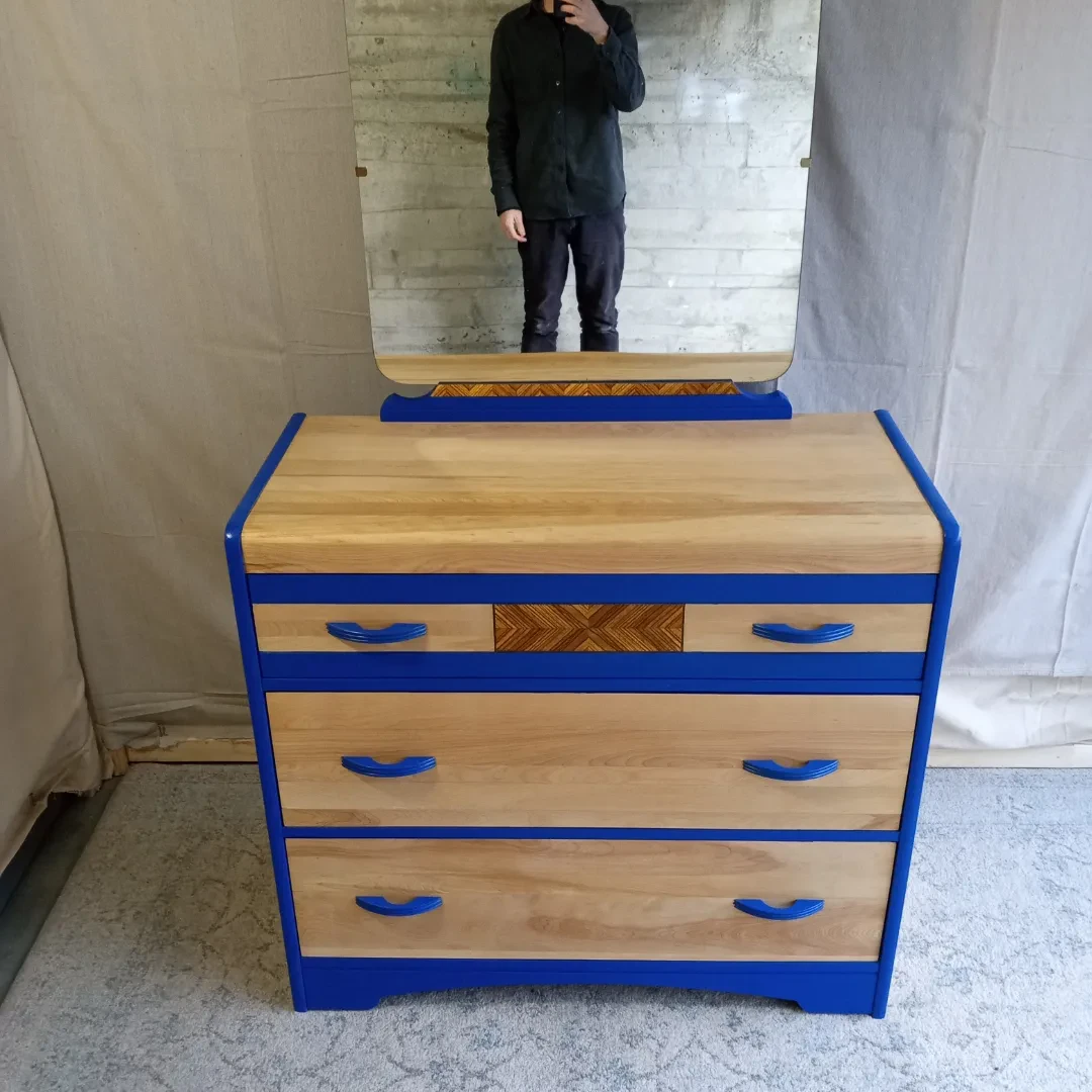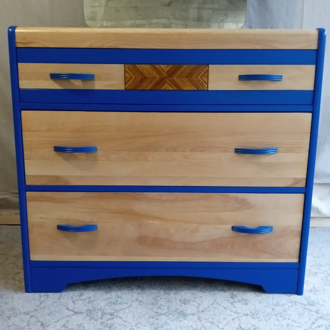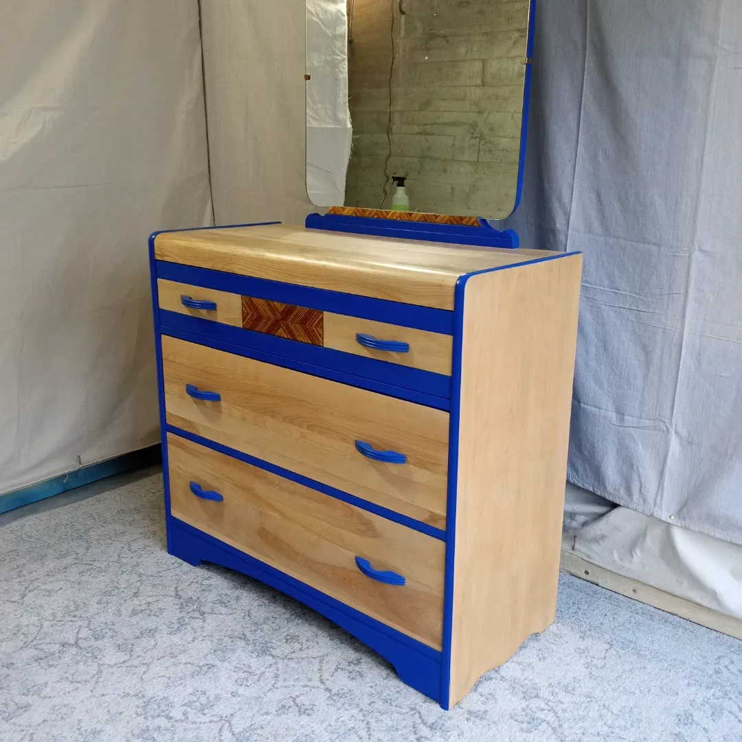 This is a small 3 drawer vintage dresser, stripped down to its natural wood finish with painted blue trim. It's retro and fun, perfect for a child's bedroom. Sealed with a water based varathane finish. It includes the detachable mirror which is in surprisingly good condition for a 60 year old piece. 38" W x 17" D x 35" H. 64" H including the mirror. Delivery is included in the price.