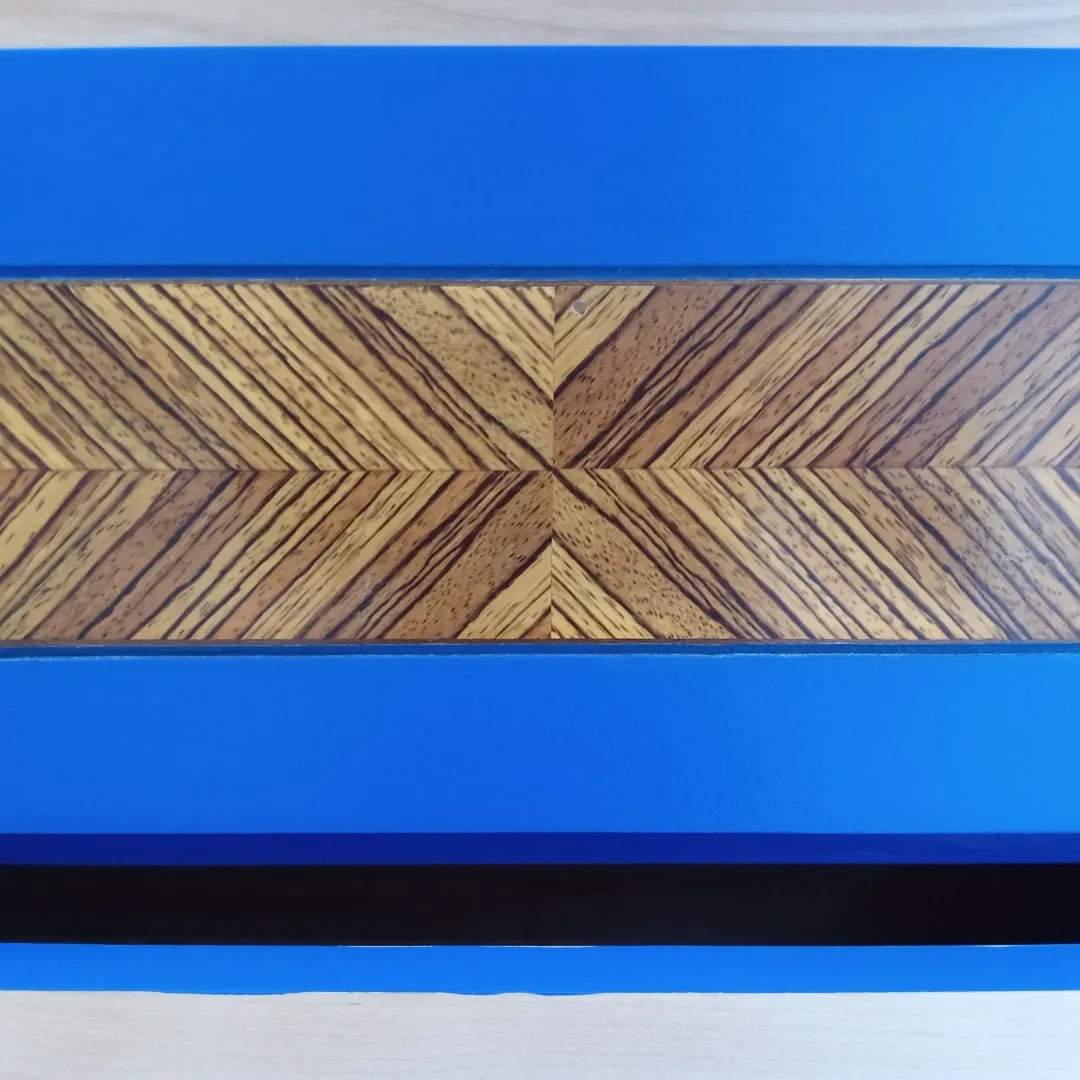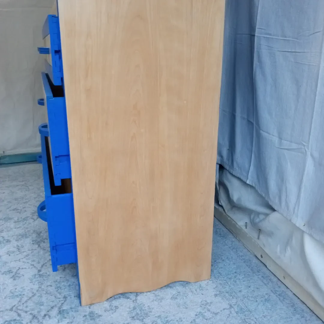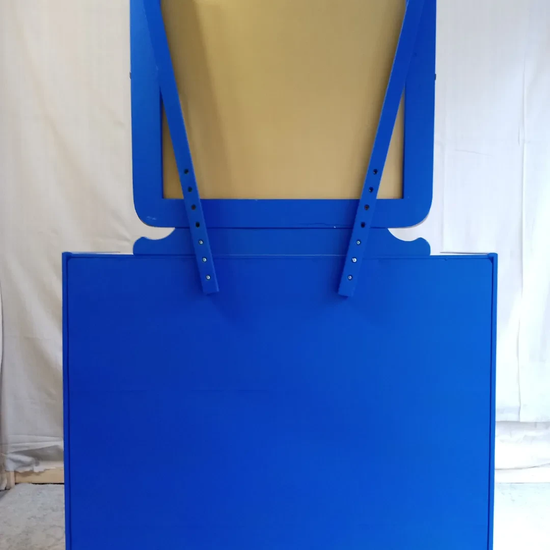 This is a small 3 drawer vintage dresser, stripped down to its natural wood finish with painted blue trim. It's retro and fun, perfect for a child's bedroom. Sealed with a water based varathane finish. It includes the detachable mirror which is in surprisingly good condition for a 60 year old piece. 38" W x 17" D x 35" H. 64" H including the mirror. Delivery is included in the price.