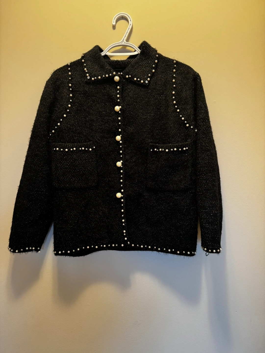Cozy black sweater with pearl accents throughout from Lady Alice. Pearls button closure. Soft material, Long sleeves. Pocket details
