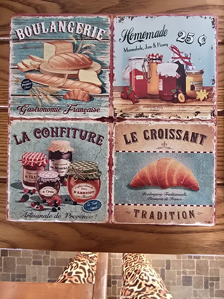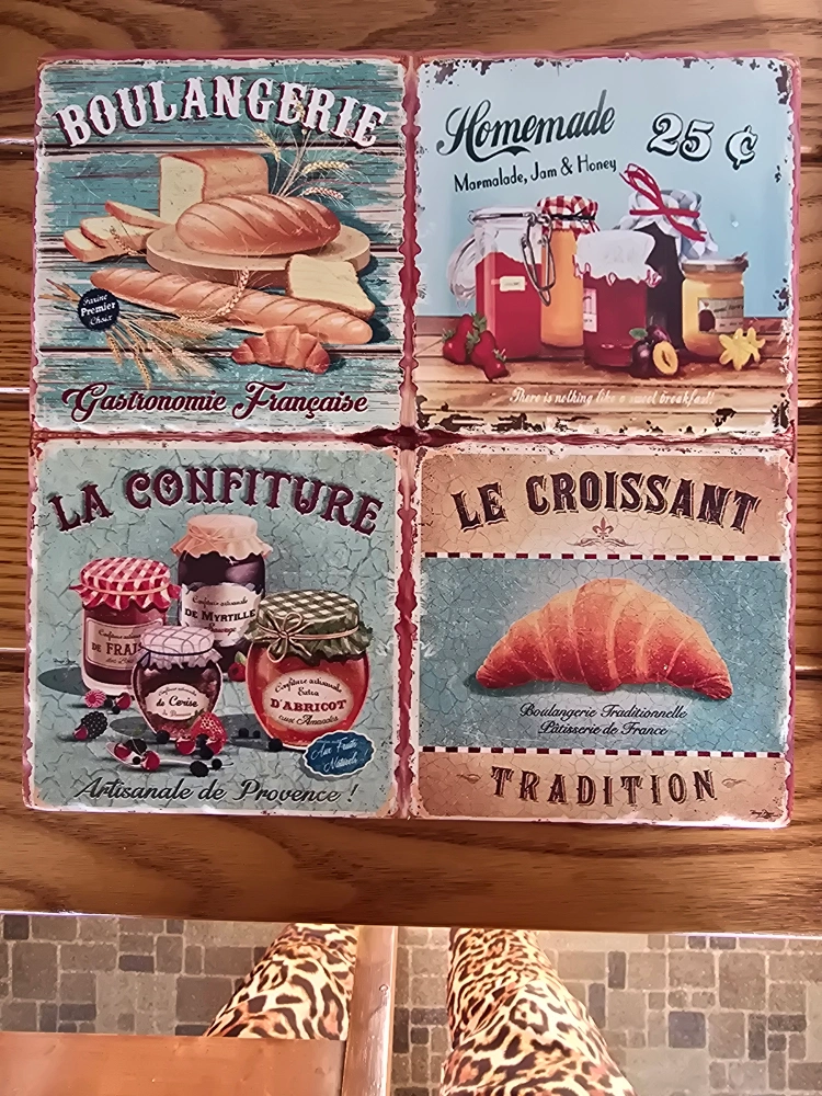 Two unique coasters featuring French and American produce imagery. Perfect for adding a touch of vintage charm to your home. Each coaster showcases a different food item with vintage-style artwork. Great conversation starter.