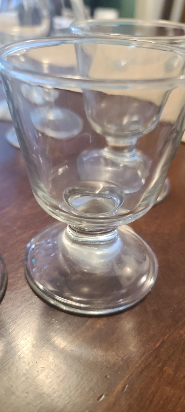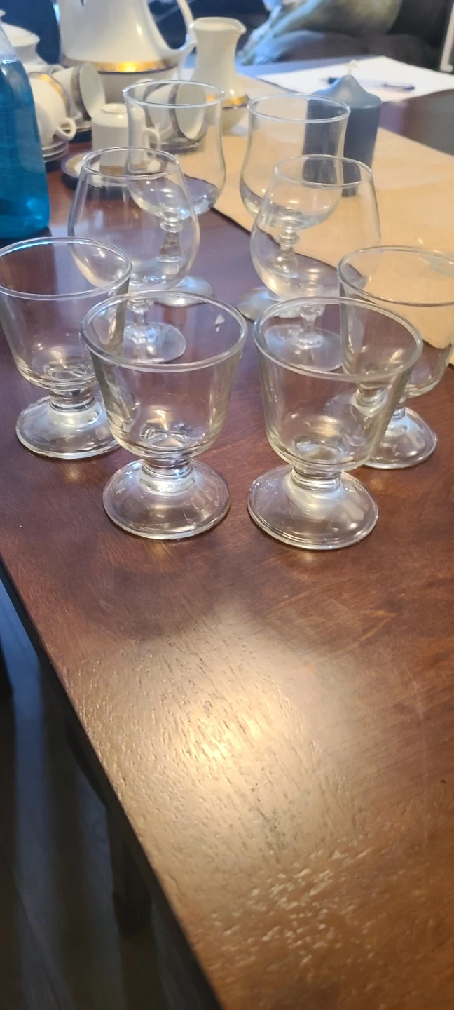 A collection of eight assorted glass pieces, including stemmed wine glasses and shot glasses. These clear glass items are perfect for serving a variety of beverages at gatherings. They're made of durable glass and ready for your next get-together!