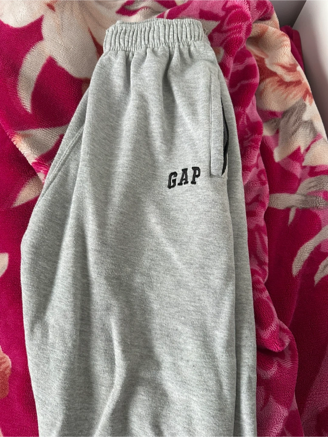 Comfy grey GAP sweatpants. Has elastic waist, zipper pocket, drawstrings inside & a GAP logo on the leg.
