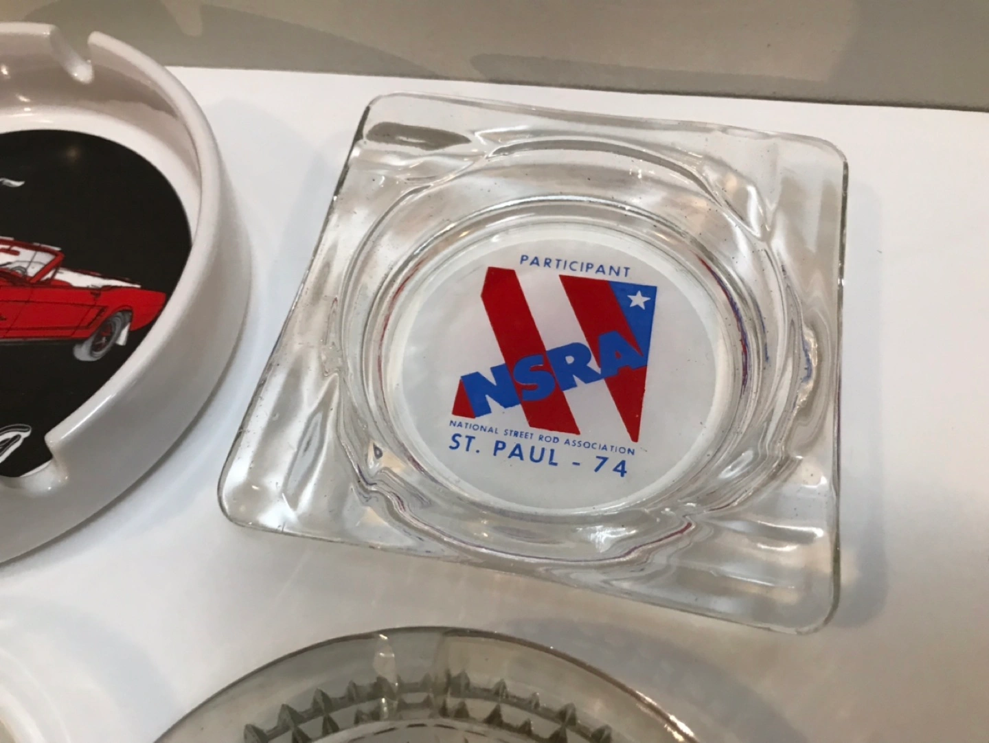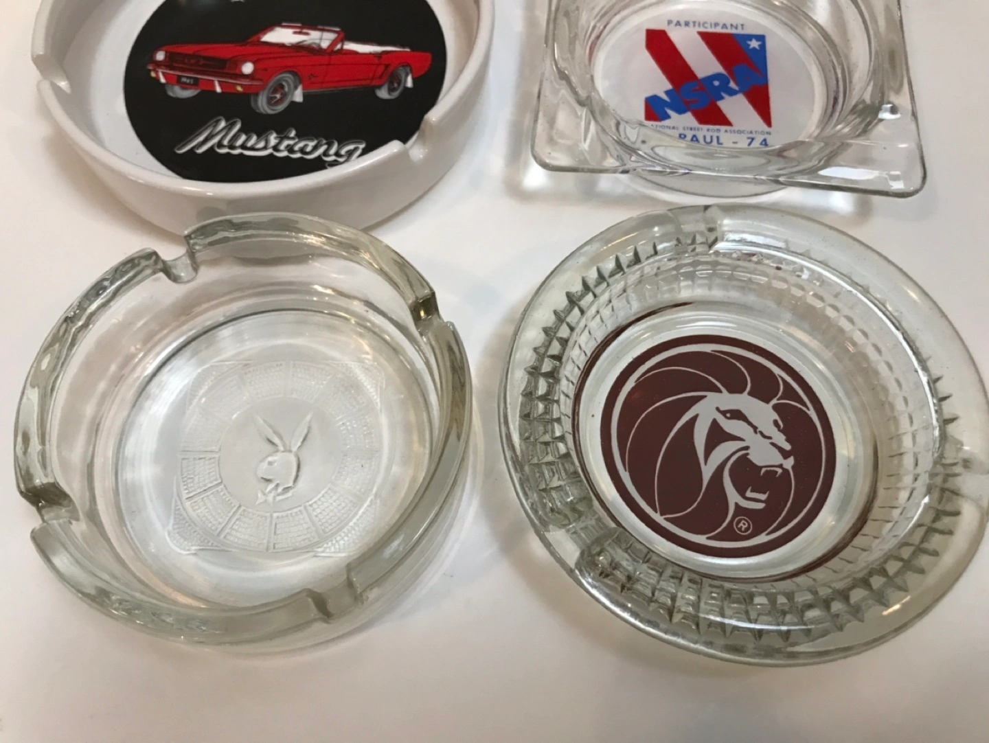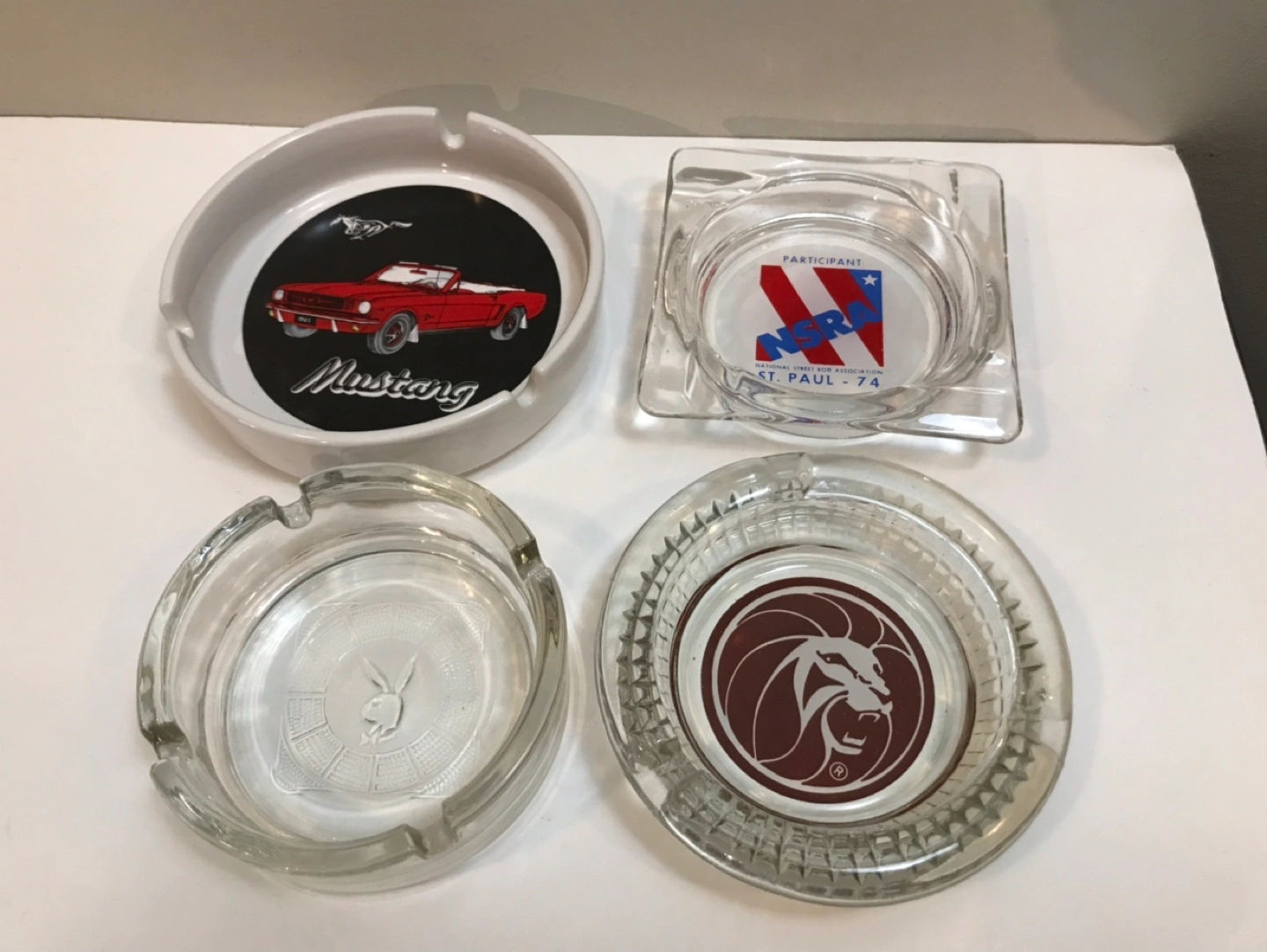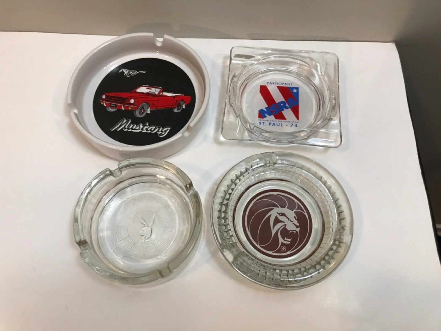 Set of four vintage ashtrays. One has a Mustang design, one has a Playboy Bunny design, and one has a lion design. The final ashtray has the NSRA logo. 5$