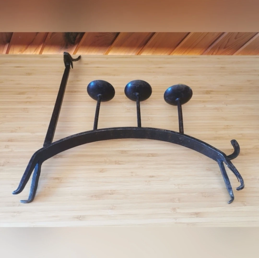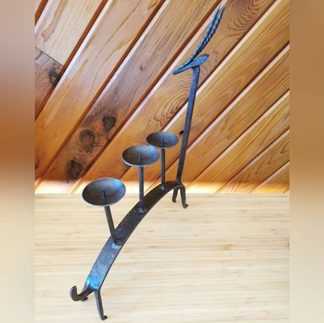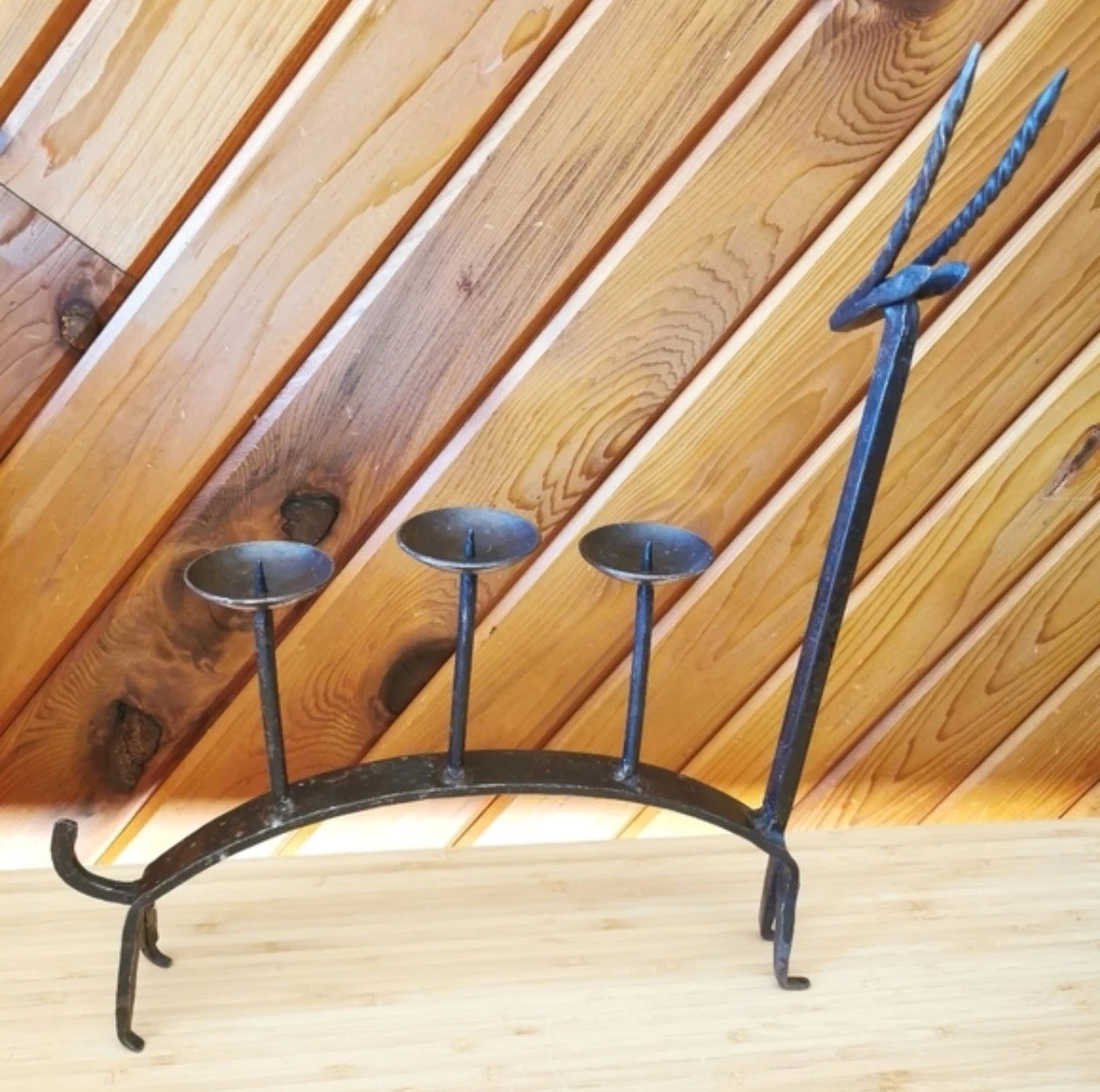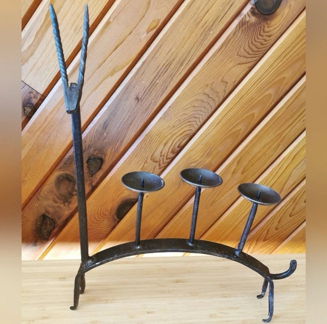 Crafted from heavy blackened iron with visible hammering and organic shaping, this piece embodies classic Brutalist studio metalwork from the mid-century era. The arched back supports three elevated candle cups for candles.