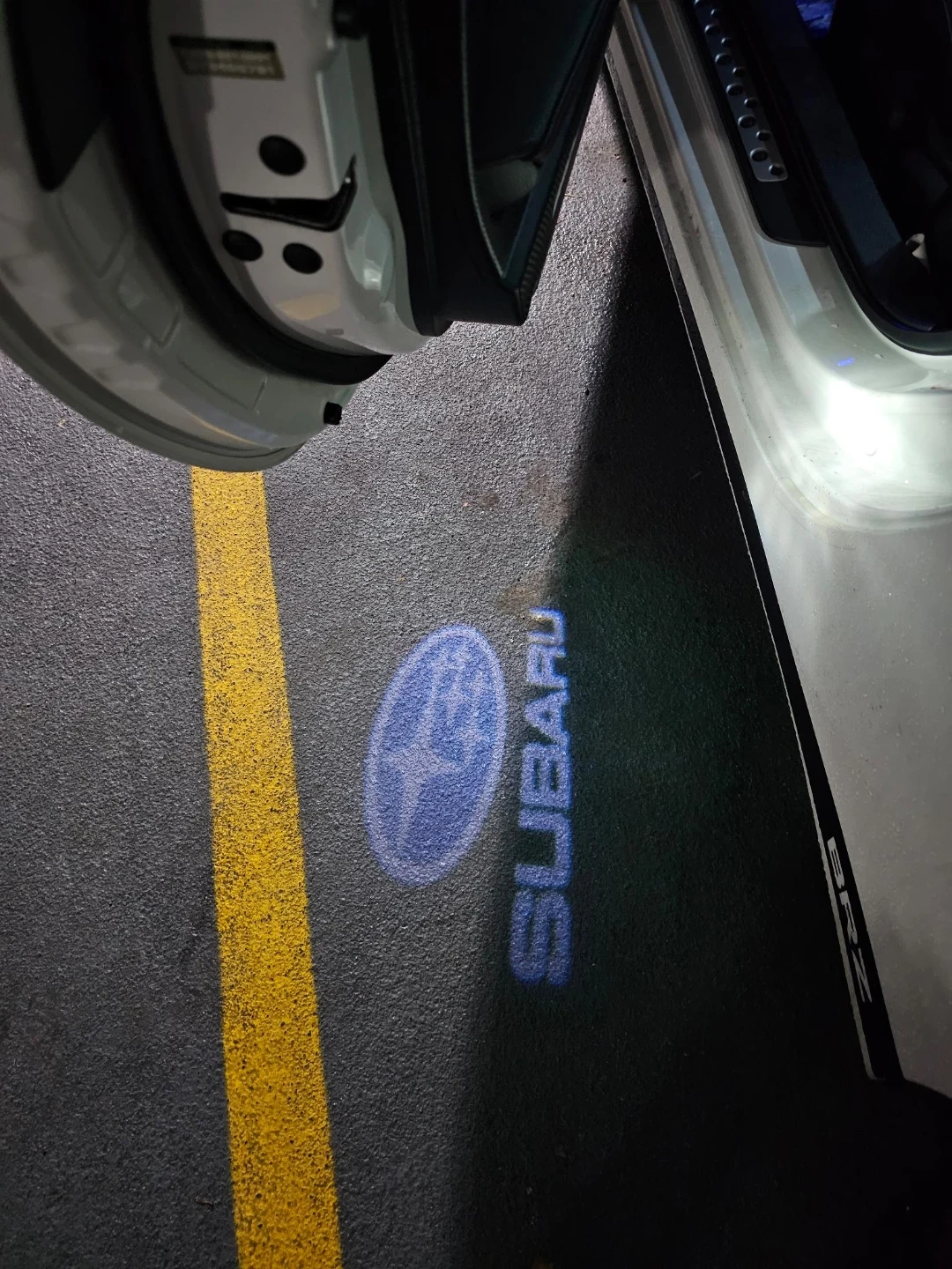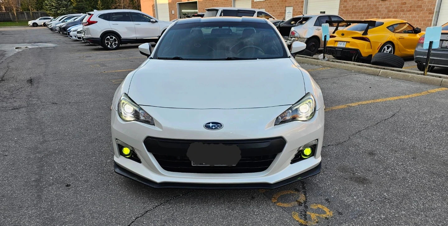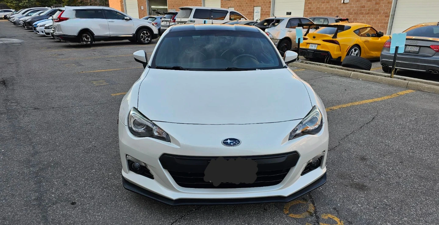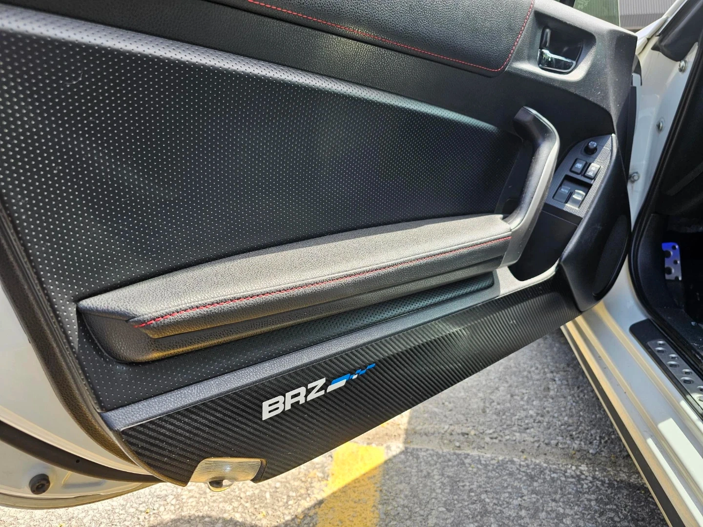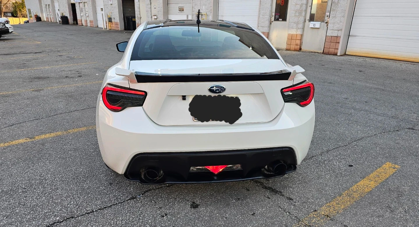 This white Subaru BRZ coupe features a sleek black accent stripe along the side. It's equipped with aftermarket black wheels and a sporty rear spoiler. Comes with tinted windows for added privacy and style.