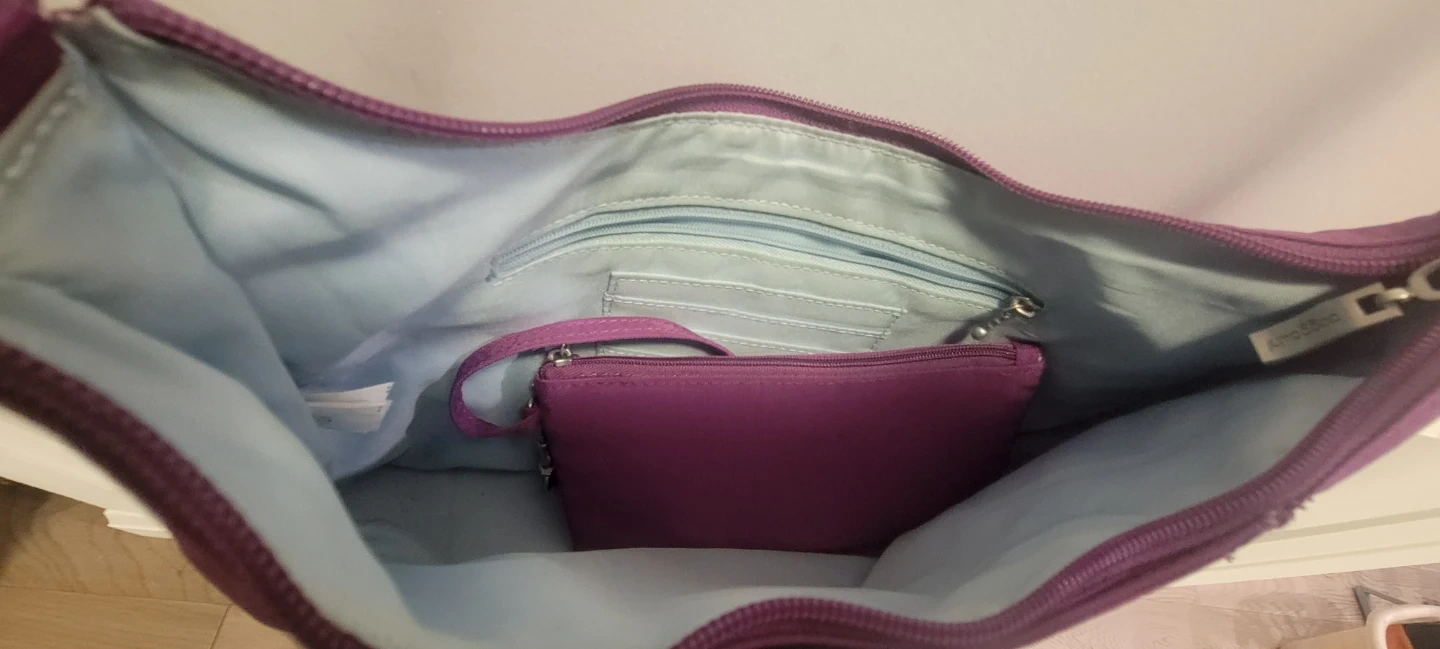 This is a purple Baggallini shoulder bag. It's made of nylon and includes a matching zippered pouch inside. The bag features an adjustable strap and multiple interior pockets.