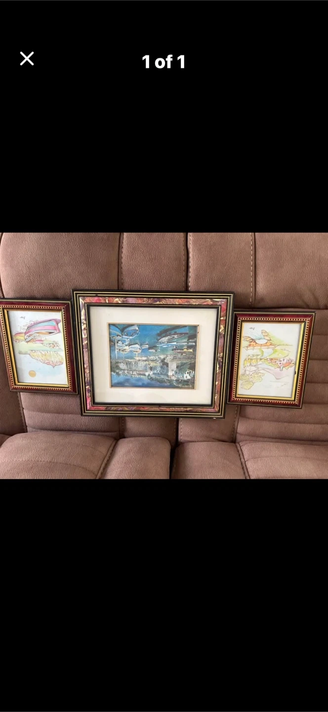 A set of two framed prints featuring nautical scenes with boats. The centre print is larger and detailed, with two smaller matching prints on either side. The frames are decorative and complement the artwork. They're ready to add charm to your wall!