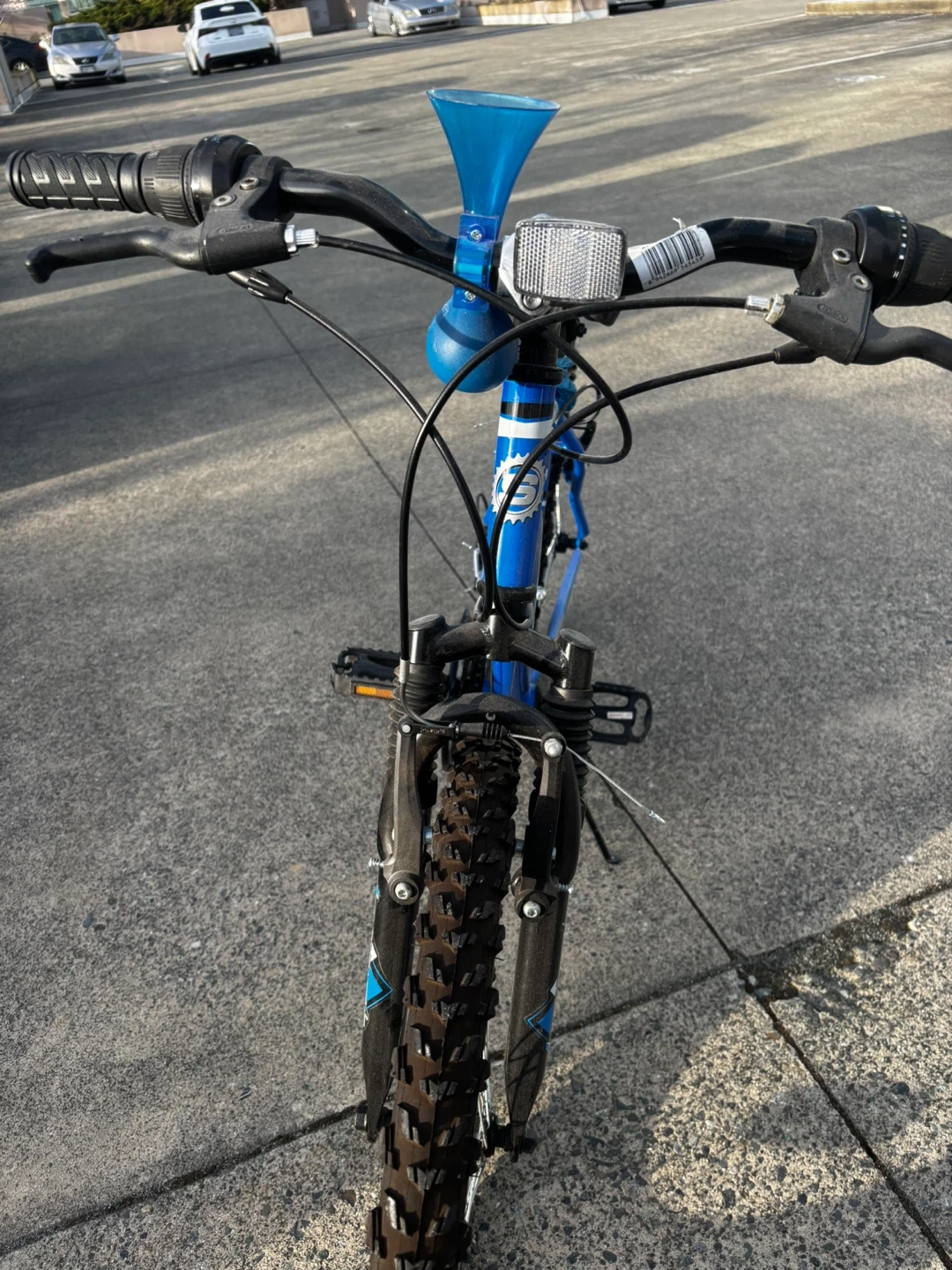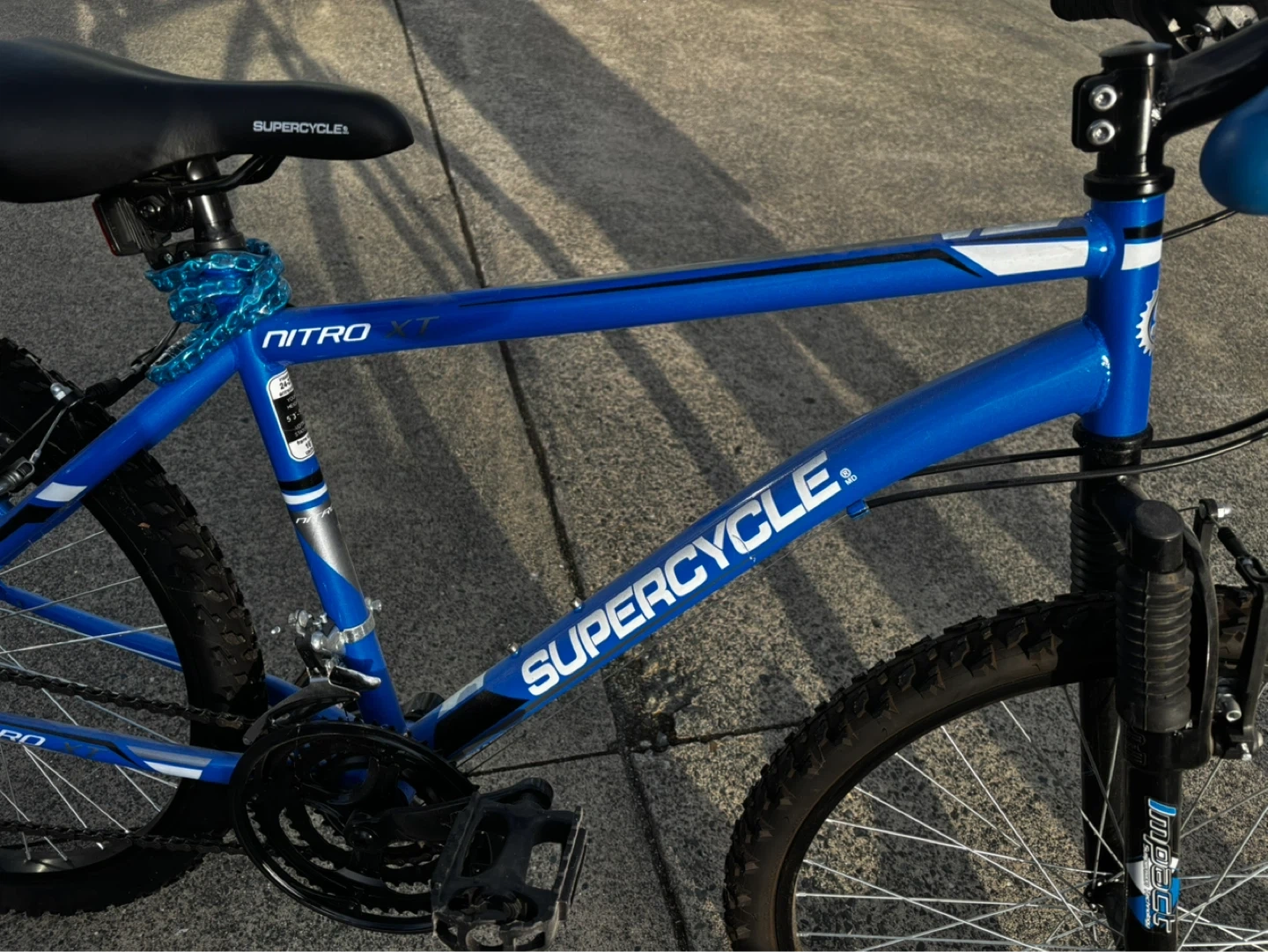 This blue Supercycle Nitro XT mountain bike is a great choice for young riders. It features a 16" frame and is recommended for heights 5'3" to 5'6". The bike is blue and has multiple gears for varied terrain.