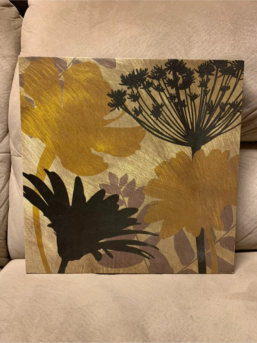 This is a canvas wall art featuring a floral design in gold and black. It's mounted on a wooden frame. It's ready to hang and adds a touch of nature-inspired elegance to any room.
