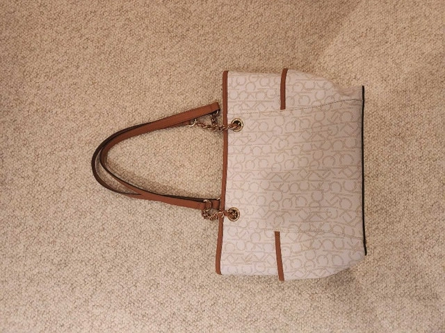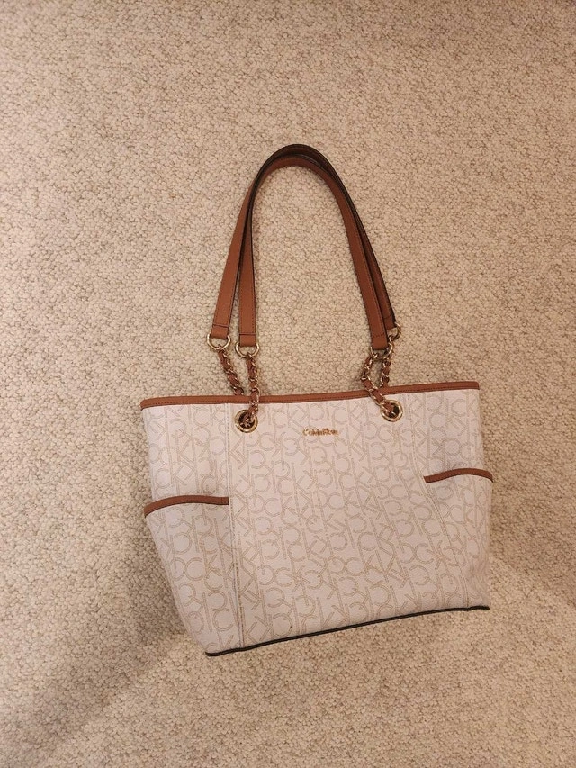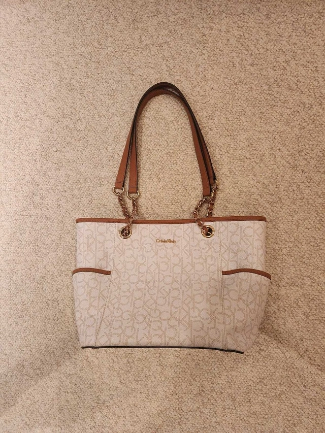 This stylish Calvin Klein tote purse features the iconic CK logo pattern, complemented by brown accents on the handles and trim. It's in used, like new condition.