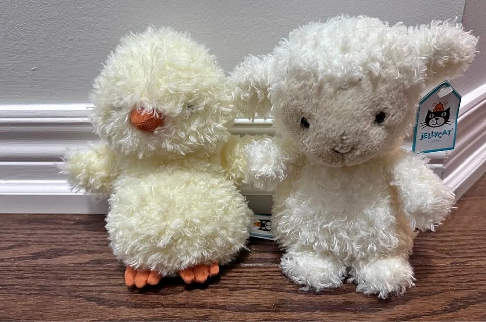 Selling two adorable Jellycat plushies: a chick and a lamb. Brand new with tags (NWT). Soft, high-quality, and perfect for gifting or collecting.
