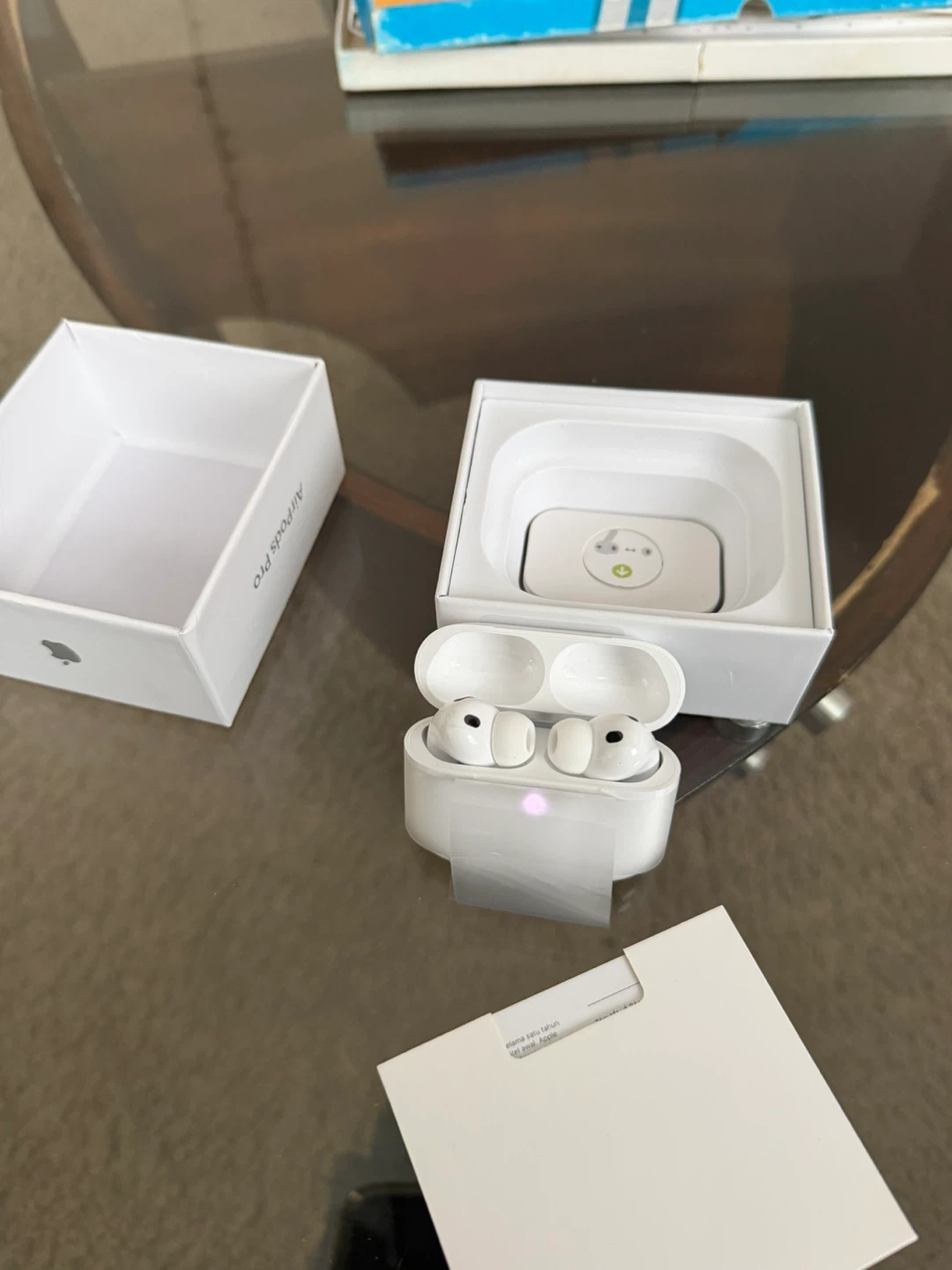 Apple AirPods Pro (2nd generation) with MagSafe Charging Case. Includes AirPods Pro, charging case, and user manual. White colour.