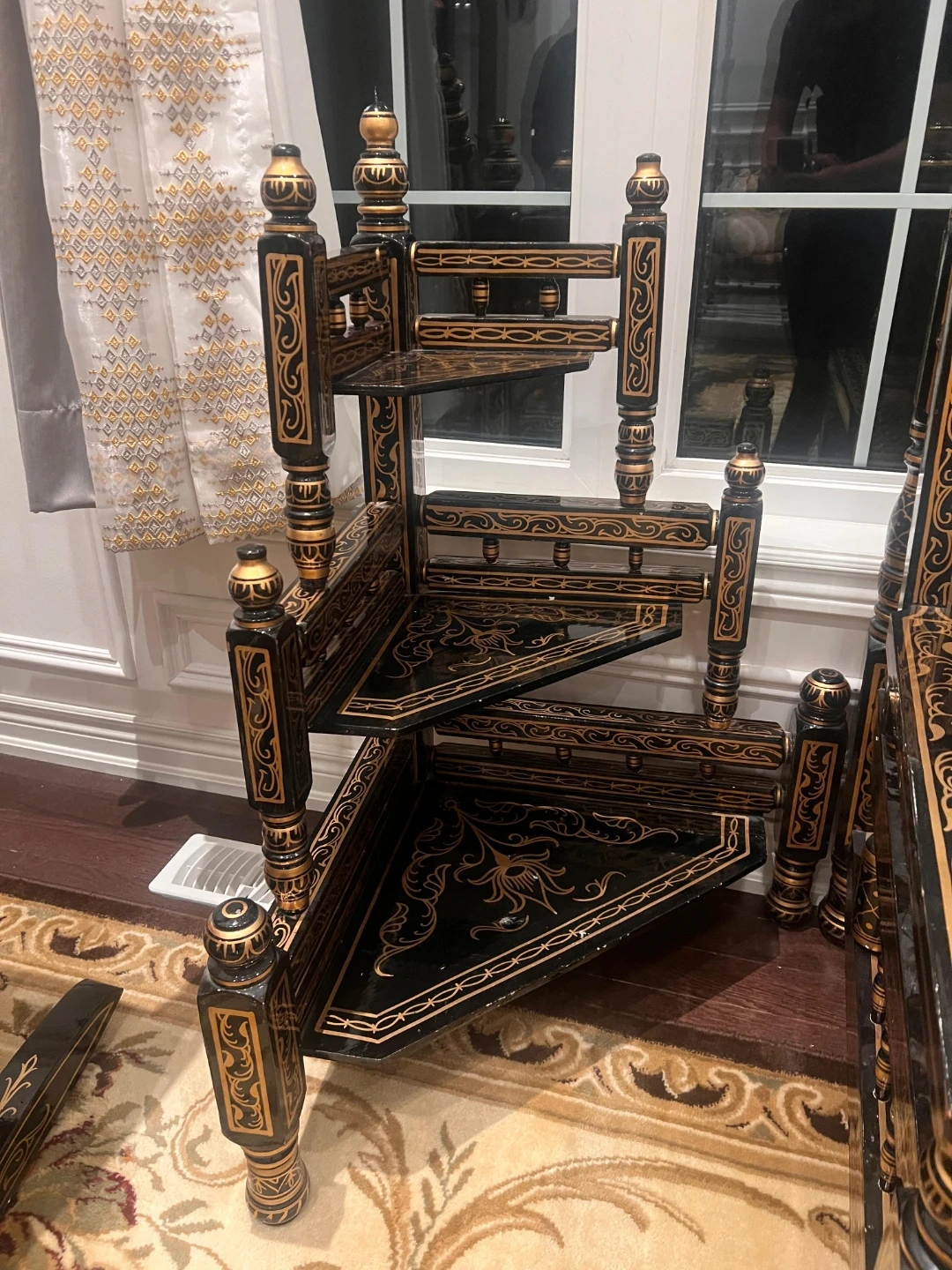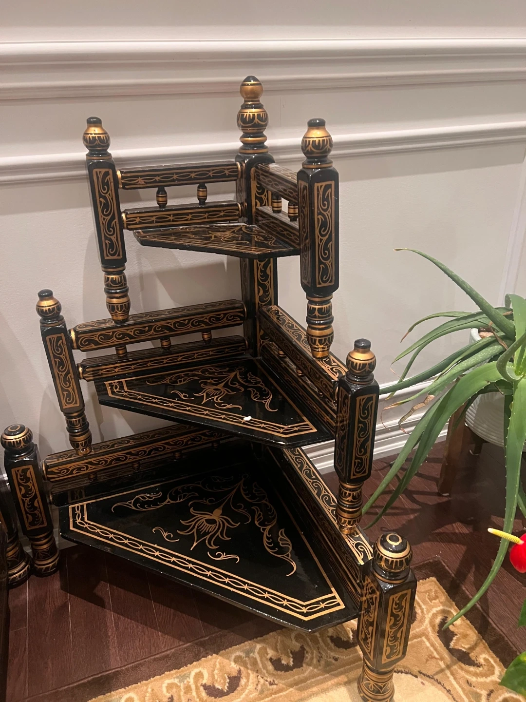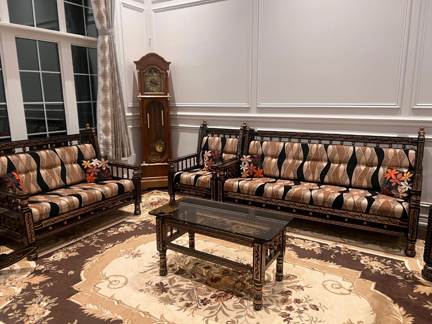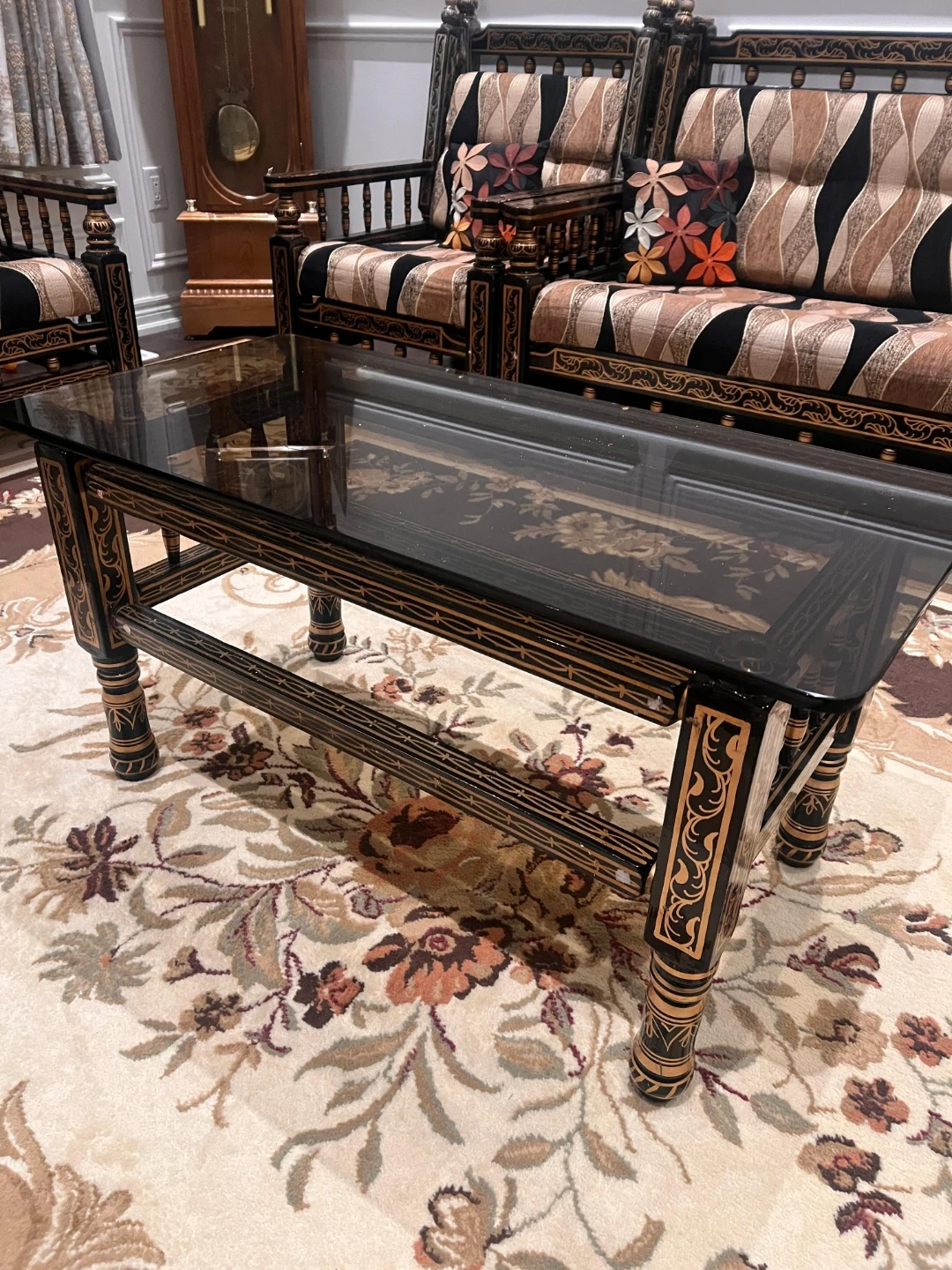 Elegant vintage sofa set and matching coffee table. Black wood with intricate gold detailing. The set includes a three-seater sofa, two accent chairs, and a glass-top coffee table. A tiered corner shelf is also included, perfect for displaying decor! Bring classic style to your living space.