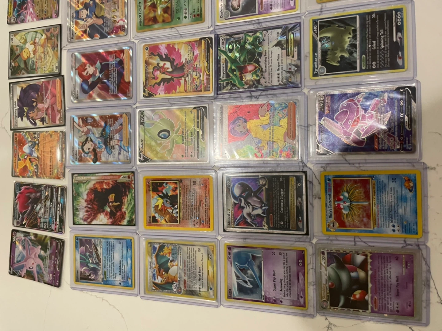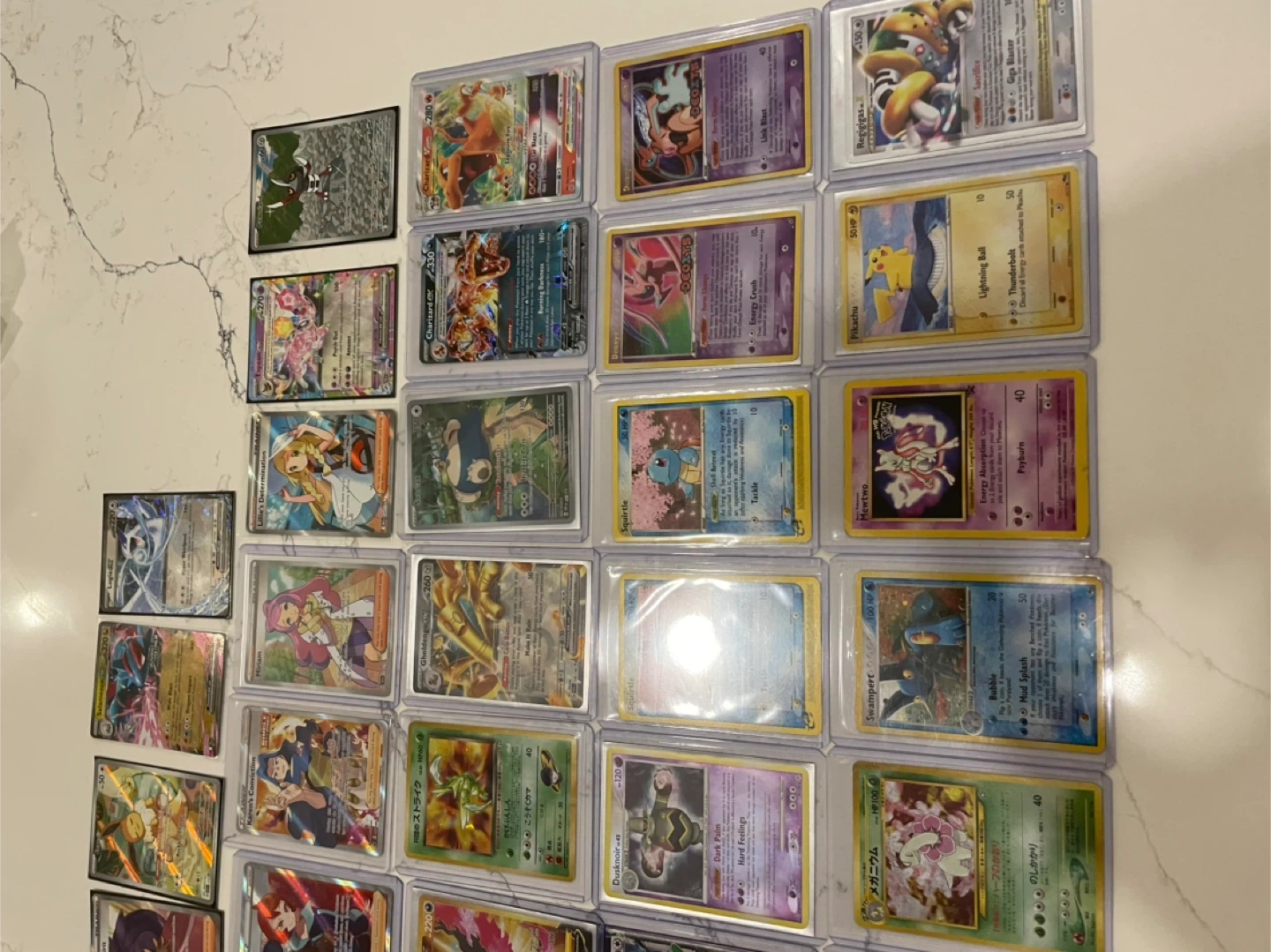 A diverse collection of Pokémon trading cards. These cards feature various characters and artwork from the Pokémon universe. They're housed in protective sleeves for safekeeping. This is a great assortment for collectors or players!