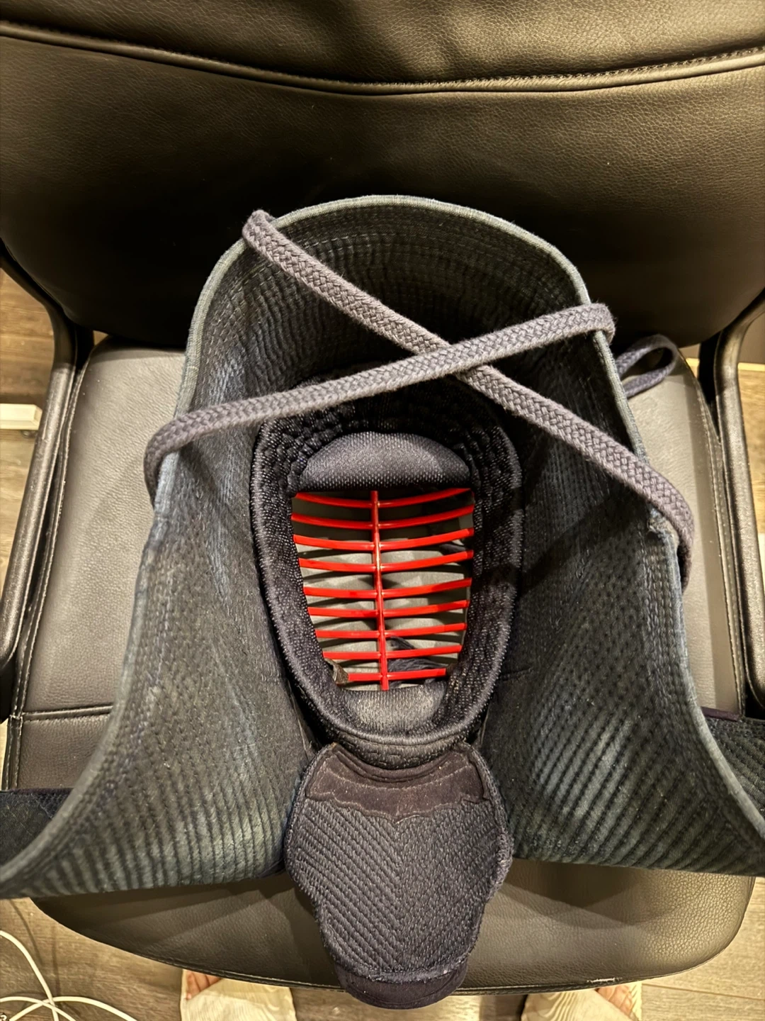 This is a Kendo Men, designed for protective headgear in martial arts practice. It features a metal grill and padded interior for safety. The dark blue fabric exterior is durable for training.