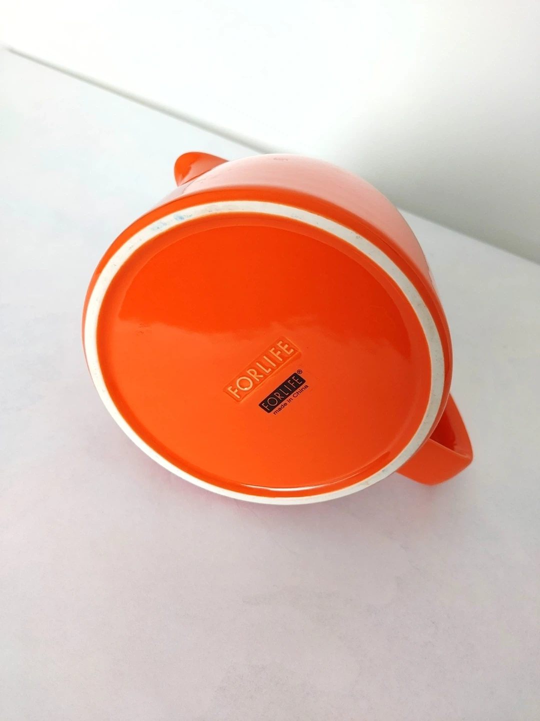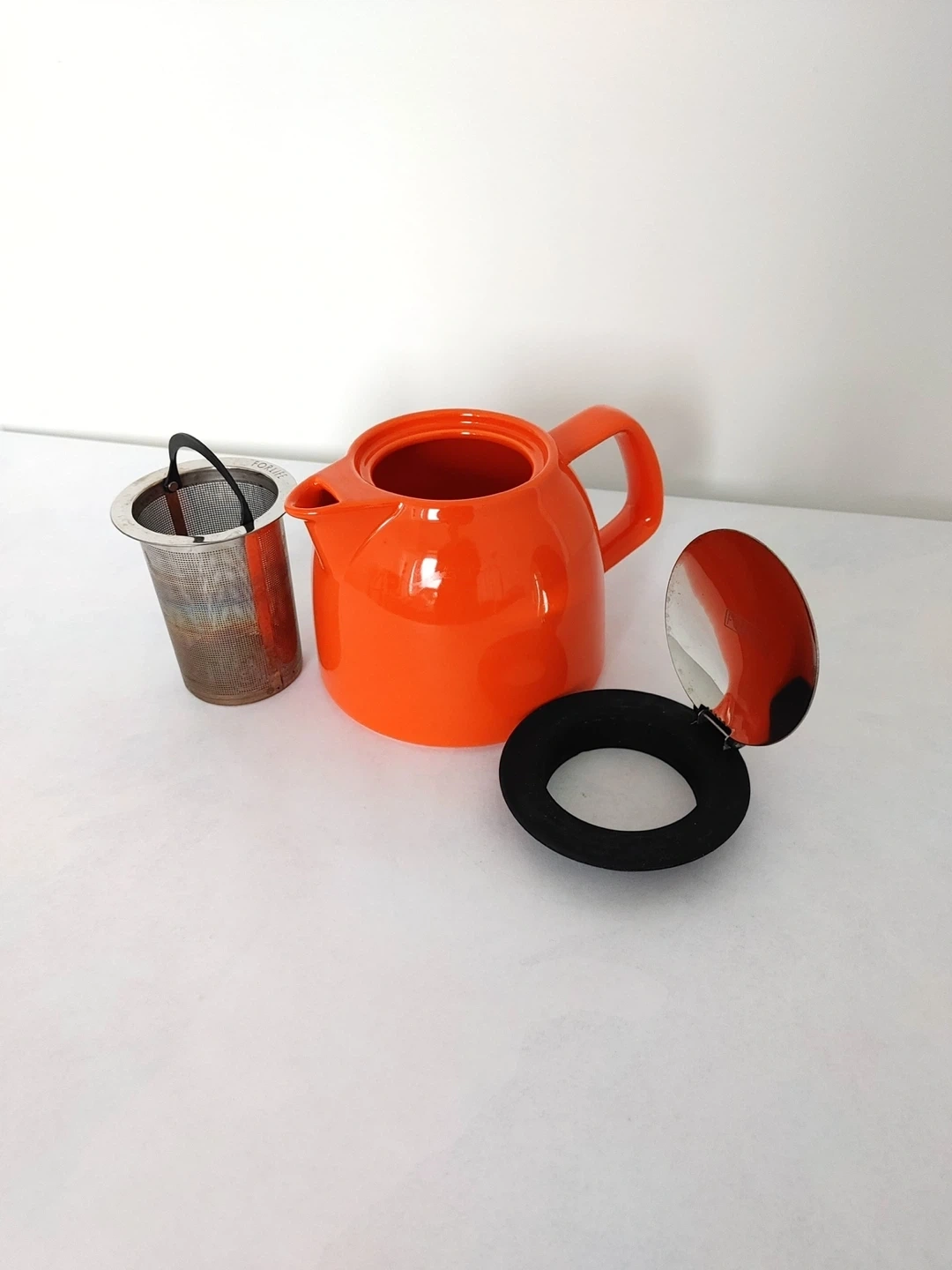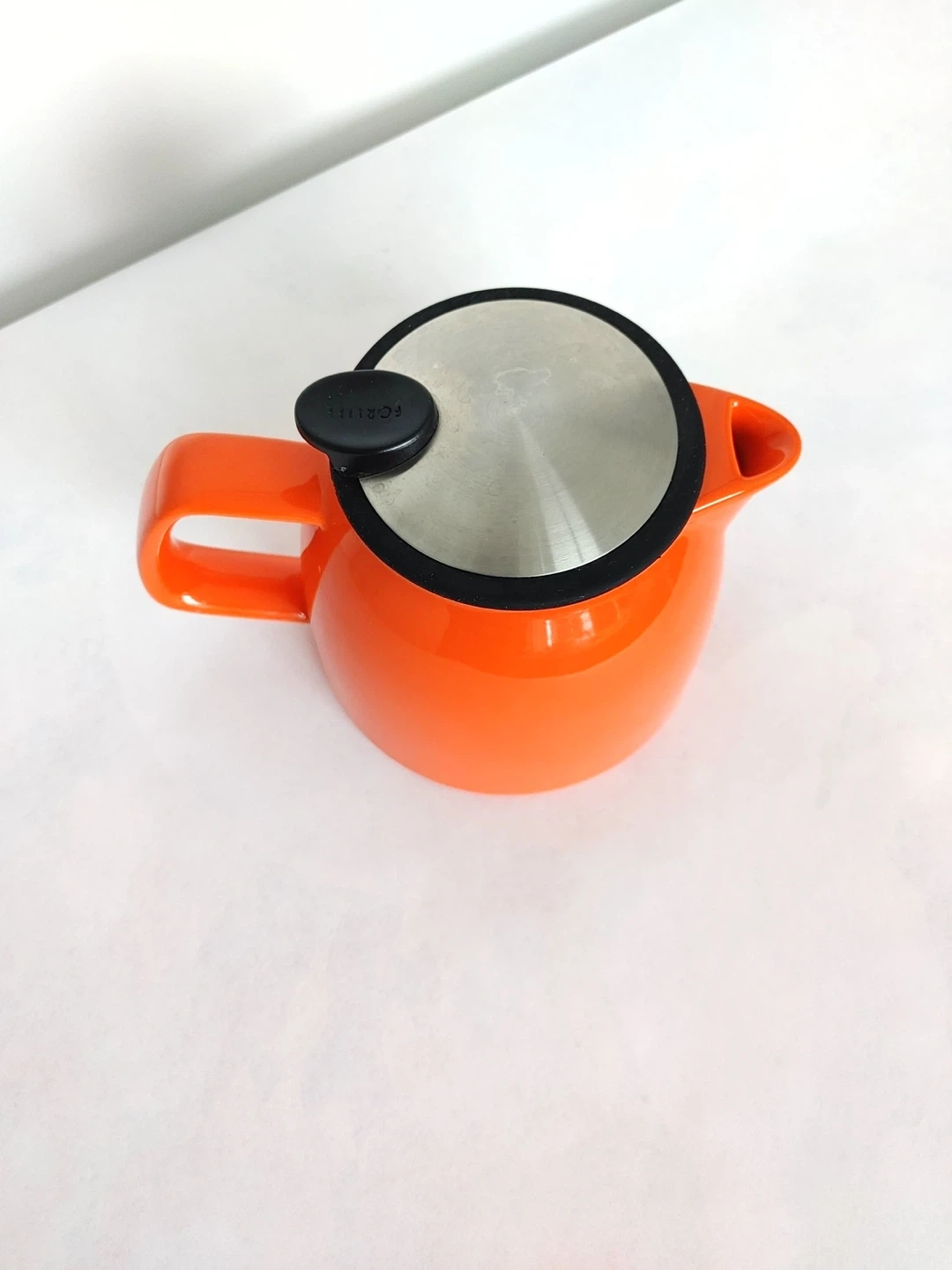 Bright orange ceramic tea pot from Forlife. It includes a removable stainless steel infuser for loose leaf tea. The lid has a brushed metal finish and a black silicone seal. Perfect for brewing your favourite teas.