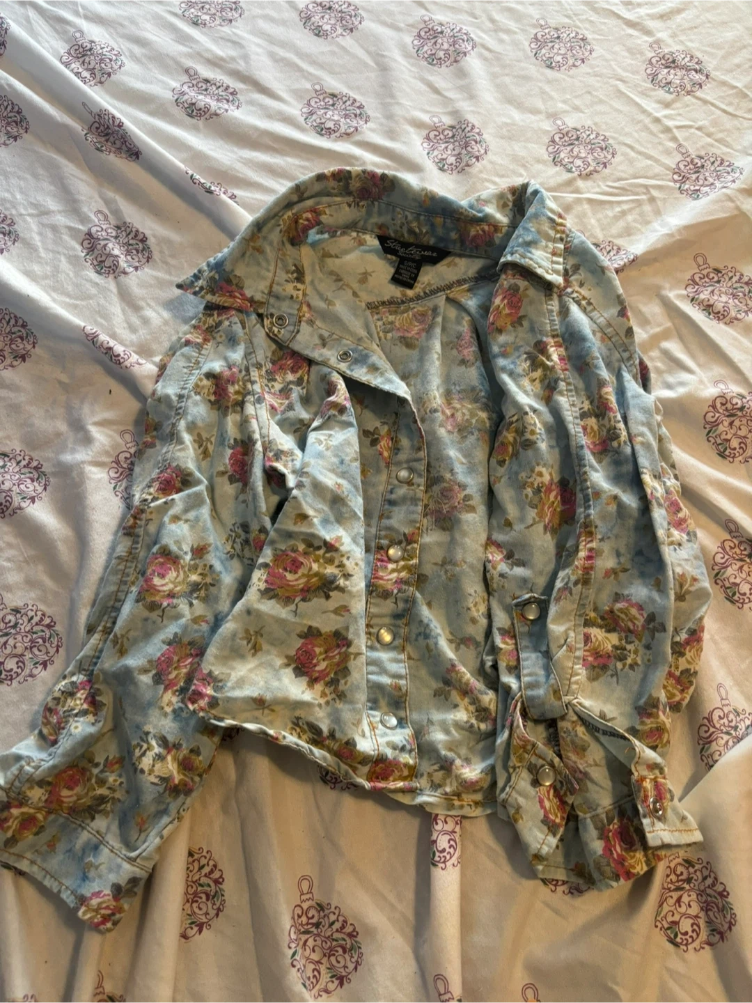 Cute floral button-up shirt from Stitches! It's a size small and features a light blue wash with a colourful floral pattern. Perfect for adding a touch of spring to your wardrobe