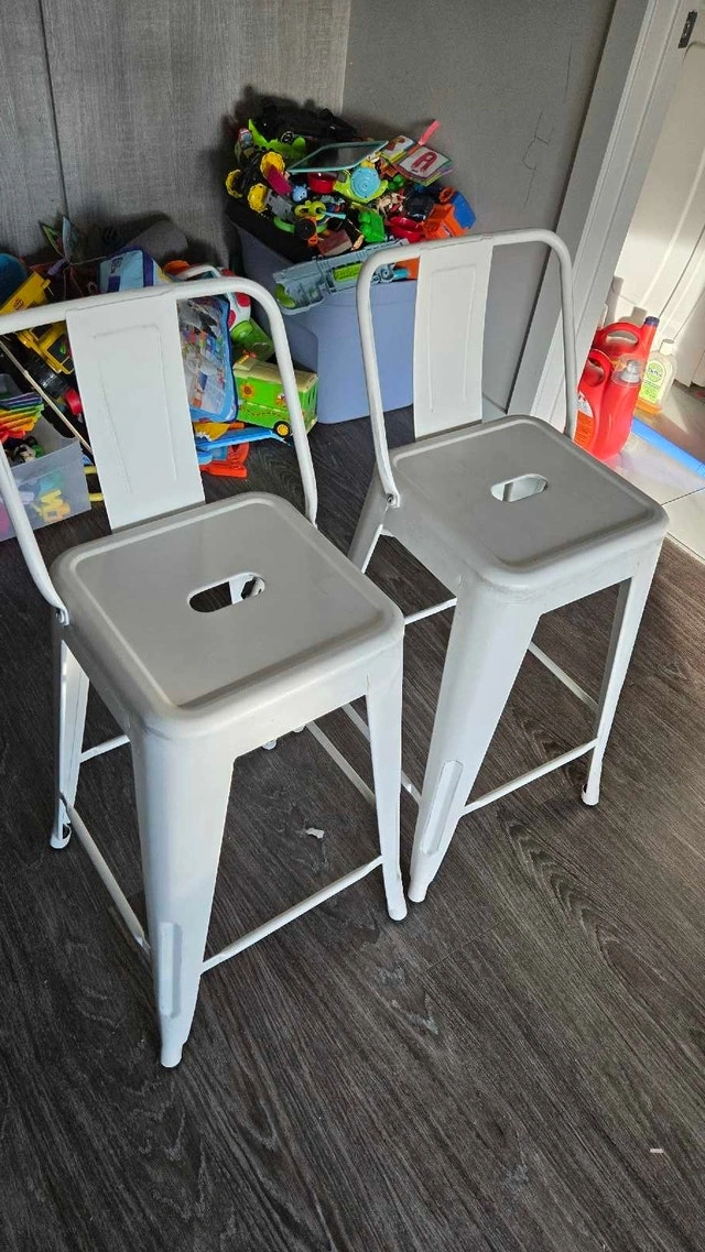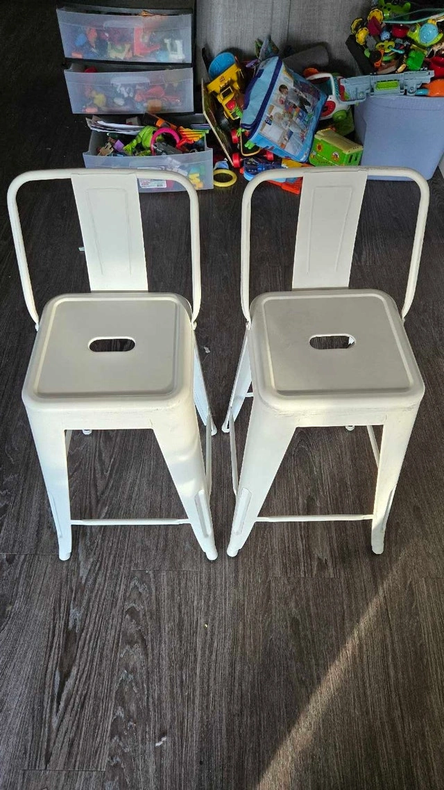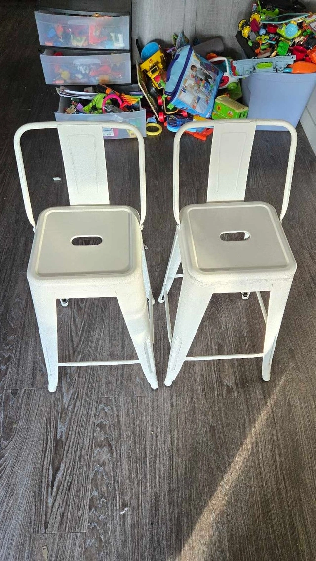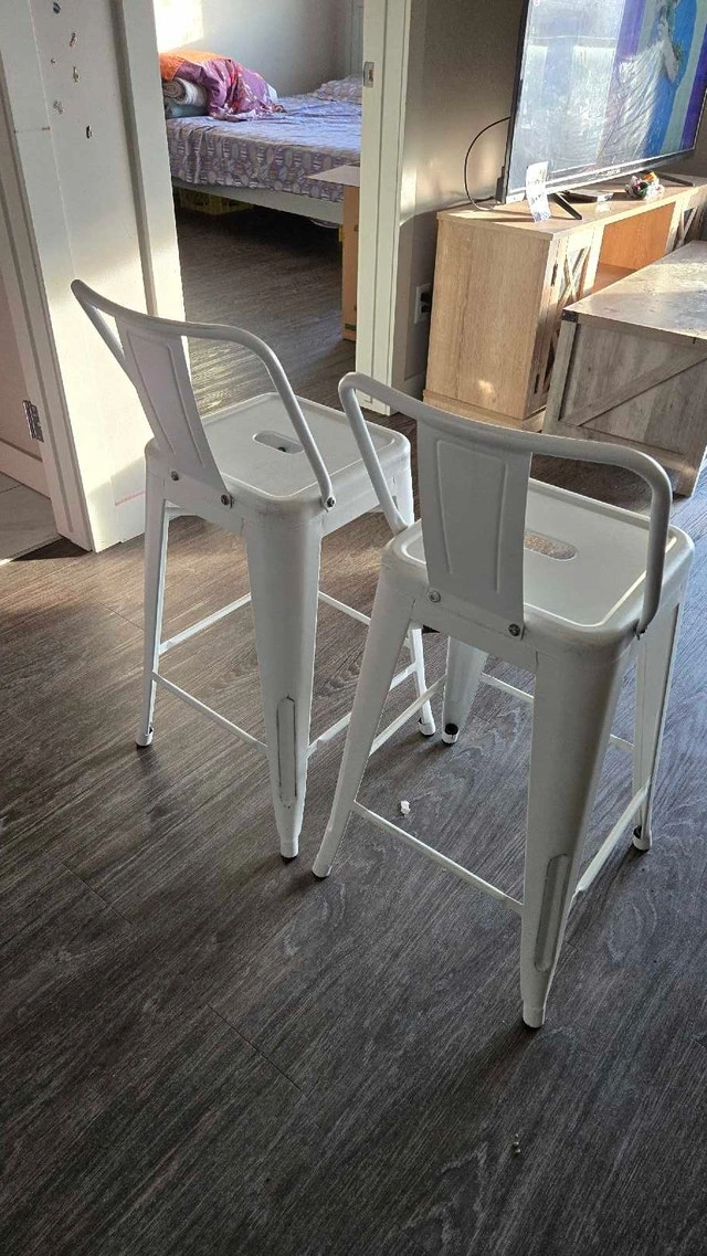 These stylish white metal bar stools are perfect for adding a modern touch to your kitchen or bar area. They are in used condition, showing some signs of wear but are still sturdy and functional. Looking to add a bit of whimsy to your home decor? These stools are the perfect perch for sipping your morning coffee or enjoying an evening cocktail. And remember, if the ad is up, they're still available! Cash accepted.