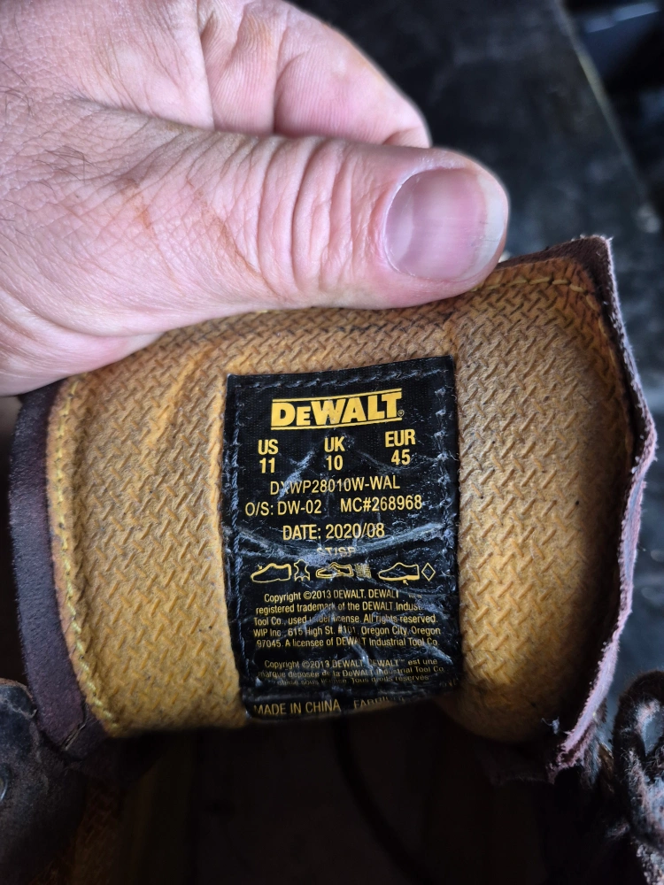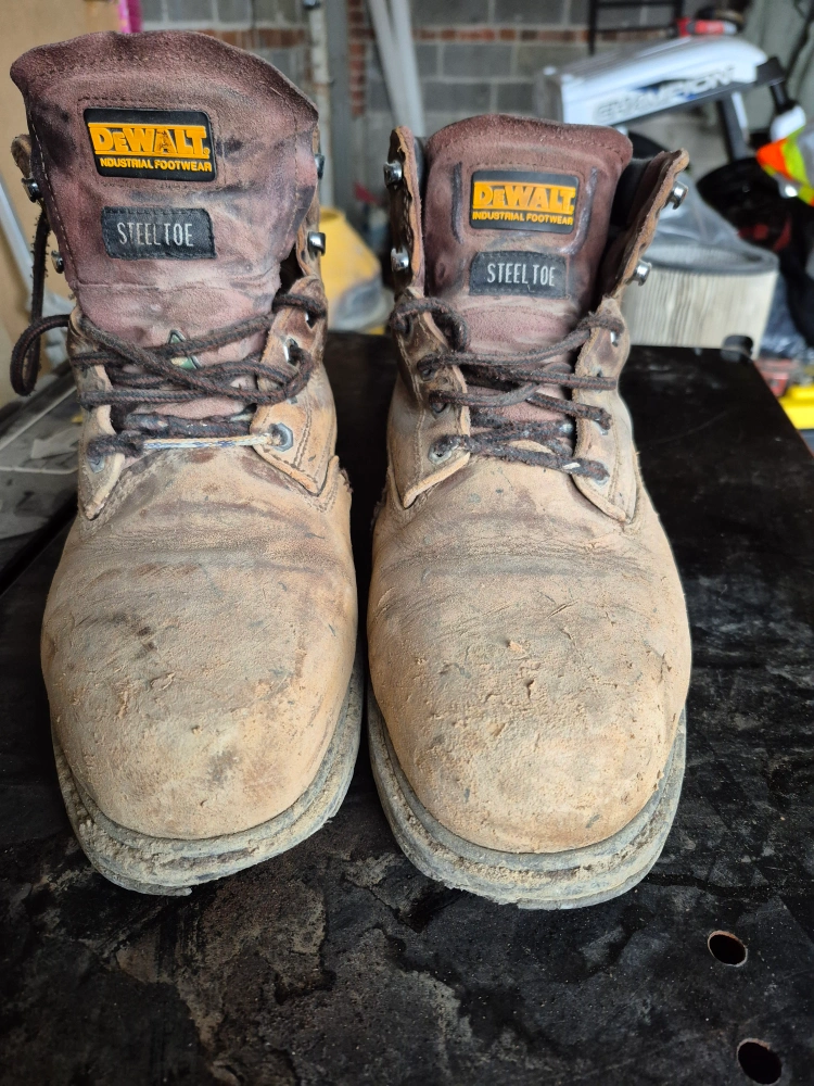 Well-worn Dewalt Industrial Footwear steel toe boots. Size 11 US, UK 10, EUR 45. Show significant wear and tear. Brown leather. Lace-up closure.