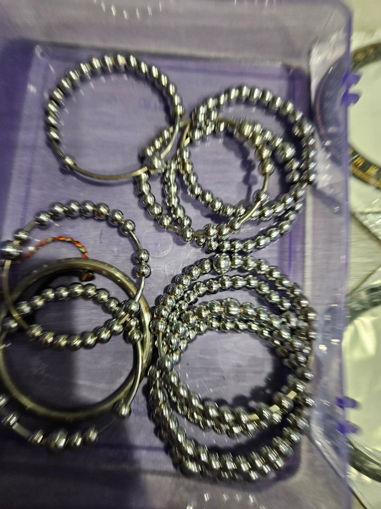 Collection of metal bangles, some plain and some beaded. Also includes several watch bezels, various styles and colours. serbloh